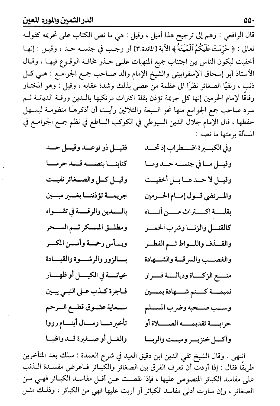 انتهى وقال الشيخ تقي الدين ابن دقيق العيد في شرح العمدة سلك بعد المتأخرين طريقا فقال إذا أردت أن تعرف الفرق بين الصغائر والكبائر فاعرض مفسدة الذنب على مفاسد الكبائر المنصوص عليها فإذا نقصت عن أقل مفاسد الكبائر فهي من الصغائر وإن ساوت أدنى مفاسد الكبائر أو أربت عليها فهي من الكبائر وذلك مثل