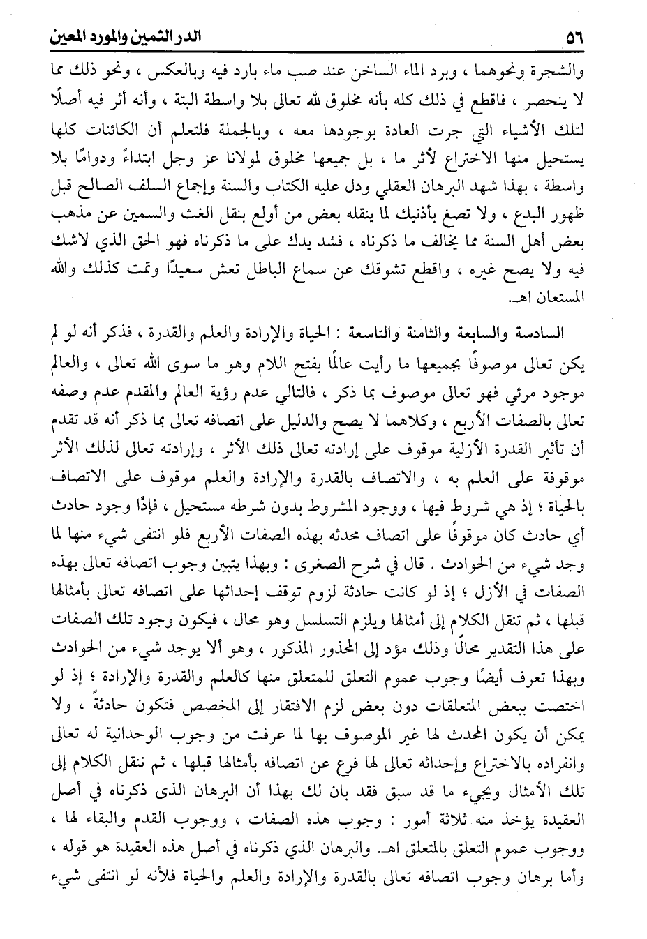 والشجرة ونحوهما وبرد الماء الساخن عند صب ماء بارد فيه وبالعكس ونحو ذلك مما لاينحصر فاقطع في ذلك كله بأنه مخلوق الله تعالى بلا واسطة ألبتة وأنه لاأثر فيه أصلاً لتلك الأشياء التي جرت العادة بوجودها معه وبالجملة فلتعلم أن الكائنات كلها يستحيل منها الاختراع لأثر ما بل جميعها مخلوق لمولانا عز وجل ابتداءً ودواماً بلا واسطة بهذا شهد البرهان العقلي ودل عليه الكتاب والسنة وإجماع السلف الصالح قبل ظهور البدع ولاتصغ بأذنيك لما ينقله بعض من أولع بنقل الغث والسمين عن مذهب بعض أهل السنة مما يخالف ماذكرناه فشد يدك على ماذكرناه فهو الحق الذي لاشك فيه ولايصح غيره واقطع تشوقك عن سماع الباطل تعش سعيداً وتمت كذلك والله المستعان اهـ. السادسة والسابعة والثامنة والتاسعة الحياة والإرادة والعلم والقدرة فذكر أنه لو لم يكن تعالى موصوفاً بجميعها مارأيت عالماً بفتح اللام وهو ماسوى الله تعالى والعالم موجود مرئي فهو تعالى موصوف بماذكر فالتالي عدم رؤية العالم والمقدم عدم وصفه تعالى بالصفات الأربع وكلاهما لايصح والدليل على تصافه تعالى بماذكر أنه قد تقدم أن تأثير القدرة الأزلية موقوف على إرادته تعالى ذلك الأثر وإرادته تعالى لذلك الأثر موقوفة على العلم به والاتصاف بالقدرة والارادة والعلم موقوف على الاتصاف بالحياة إذ هي شروط فيها ووجود المشروط بدون شرطه مستحيل فإذاً وجود حادث أي حادث كان موقوفاً على اتصاف محدثه بهذه الصفات الأربع فلو انتفى شيء منها لماوجد شيء من الحوادث قال في شرح الصغرى وبهذا يتبين وجوب اتصافه تعالى بهذه الصفات في الأزل إذ لو كانت حادثة لزوم توقف إحداثها على اتصافه تعالى بأمثالها قبلها ثم تنقل الكلام إلى أمثالها ويلزم التسلسل وهو محال فيكون وجود تلك الصفات على هذا التقدير محالاً وذلك مؤد إلى المحذور المذكور وهو أن لايوجد شيء من الحوادث وبهذا تعرف أيضاً وجوب عموم التعلق للمتعلق منها كالعلم والقدرة والإرادة إذ لو اختصت ببعض المتعلقات دون بعض لزم الافتقار إلى المخصص فتكون حادثةً ولايمكن أن يكون المحدث لها غير الموصوف بها لماعرفت من وجوب الوحدانية له تعالى وانفراده بالاختراع وإحداثه تعالى لها فرع عن اتصافه بأمثالها قبلها ثم تنقل الكلام إلى تلك الأمثال ويجيء ماقد سبق فقد بان لك بهذا أن البرهان الذى ذكرناه في أصل العقيدة يؤخذ منه ثلاثة أمور وجوب هذه الصفات ووجوب القدم والبقاء لها ووجوب عموم التعلق بالمتعلق اهـ والبرهان الذي ذكرناه في أصل هذه العقيدة هو قوله وأما برهان وجوب اتصافه تعالى بالقدرة والإرادة والعلم والحياة فلأنه لو انتفى شيء