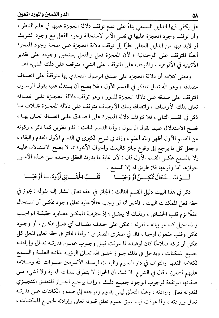 ذكر في هذا البيت دليل القسم الثالث الجائز في حقه تعالى المشار إليه بقوله يجوز في حقه فعل الممكنات البيت فأخبرأنه لو وجب عقلاً عليه تعالى وجود ممكن أواستحال عقلاً لزم قلب الحقائق وذلك لايعقل إذ حقيقة الممكن مغايرة لحقيقة الواجب والمستحيل كما مر بيانه فقوله ممكن على حذف مضاف أي فعل ممكن أو وجود ممكن وقلب مفعول وجبا قال في صغرى الصغرى وأما الجائز في حقه تعالى ففعل كل ممكن أو تركه صلاحاً كان أوضده لما عرفت قبل وجوب عموم قدرته تعالى وإرادته لجميع الممكنات، ويدخل في ذلك جواز خلق الله تعالى الرؤية لذاته العلية والسمع لكلامه القديم والثواب في دار النعيم والبعث لرسله الأكرمين صلوات الله وسلامه عليهم أجمعين قال في الشرح: لاشك أن الجواز لايتطرق للذات العلية ولالشيء من صفاتها المرتفعة لوجوب الوجود لجميع ذلك وإنما يرجع الجواز للتعلق التنجيري لقدرته تعالى وإرادته وهذا التعلق ليس بقديم مرجعه إلى صدور الكائنات عن قدرته تعالى وإرادته ولما عرفت فيما سبق عموم تعلق قدرته تعالى وإرادته لجميع الممكنات،