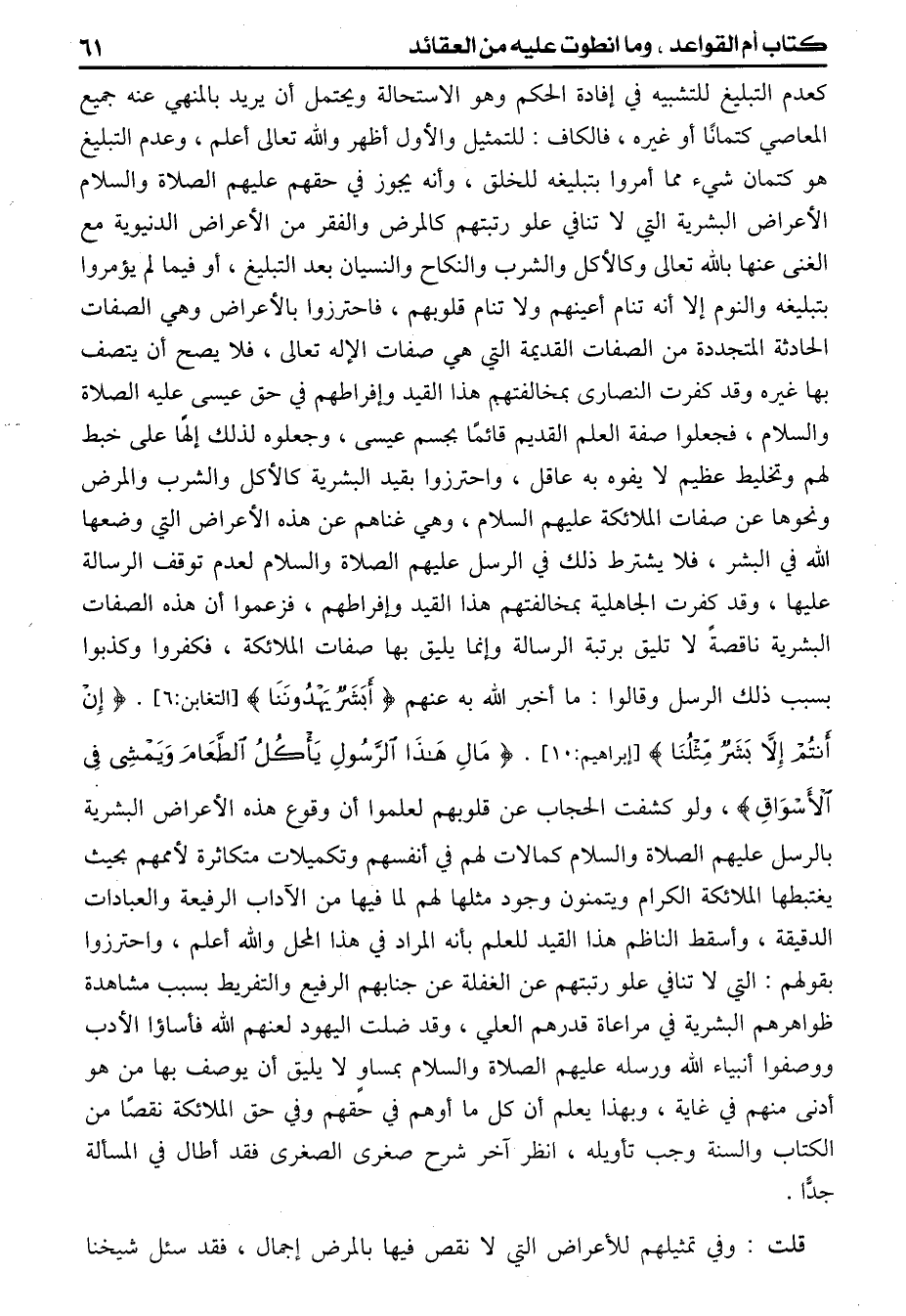 كعدم التبليغ للتشبيه في إفادة الحكم وهو الاستحالة ويحتمل أن يريد بالمنهي عنه جميع المعاصي كتماناً أو غيره فالكاف للتمثيل والأول أظهر والله تعالى أعلم وعدم التبليغ هو كتمان شيء مما أمروا بتبليغه للخلق وأنه يجوز في حقهم عليهم الصلاة والسلام الأعراض البشرية التي لاتنافي علو رتبتهم كالمرض والفقر من الأعراض الدنيوية مع الغنى عنها بالله تعالى وكالأكل والشرب والنكاح والنسيان بعد التبليغ أو فيما لم يؤمروا بتبليغه والنوم إلا أنه تنام أعينهم ولاتنام قلوبهم فاحترزوا بالأعراض وهي الصفات الحادثة المتجددة من الصفات القديمة التي هي صفات الإله تعالى فلا يصح أن يتصف بهاغيره وقد كفرت النصارى بمخالفتهم هذا القيد وإفراطهم في حق عيسى عليه الصلاة والسلام فجعلوا صفة العلم القديم قائماً بجسم عيسى وجعلوه لذلك إلهاً على خبط لهم وتخليط عظيم لايفوه به عاقل واحترزوا بقيد البشرية كالأكل والشرب والمرض ونحوها عن صفات الملائكة عليهم السلام وهي غناهم عن هذه الأعراض التي وضعها الله في البشر فلا يشترط ذلك في الرسل عليهم الصلاة والسلام لعدم توقف الرسالة عليها وقد كفرت الجاهلية بمخالفتهم هذا القيد وإفراطهم فزعموا أن هذه الصفات البشرية ناقصةً لاتليق برتبة الرسالة وإنما يليق بها صفات الملائكة فكفروا وكذبوا بسبب ذلك الرسل وقالوا ماأخبر الله به عنهم (أبشر يهدوننا). (إن أنتم إلا بشر مثلنا). (مال هذا الرسول يأكل الطعام ويمشي في الأسواق) ولو كشفت الحجاب عن قلوبهم لعلموا أن وقوع هذه الأعراض البشرية بالرسل عليهم الصلاة والسلام كمالات لهم في أنفسهم وتكميلات متكاثرة لأممهم بحيث يغتبطها الملائكة الكرام ويتمنون وجود مثلها لهم لما فيها من الآداب الرفيعة والعبادات الدقيقة وأسقط الناظم هذا القيد للعلم بأنه المراد في هذا المحل والله أعلم واحترزوا بقولهم التي لاتنافي علو رتبتهم عن الغفلة عن جنابهم الرفيع والتفريط بسبب مشاهدة ظواهرهم البشرية في مراعاة قدرهم العلي وقد ضلت اليهود لعنهم الله فأساؤا الأدب ووصفوا أنبياء الله ورسله عليهم الصلاة والسلام بمساوٍ لايليق أن يوصف بها من هو أدنى منهم في غاية وبهذا يعلم أن كل ماأوهم في حقهم وفي حق الملائكة نقصاً من الكتاب والسنة وجب تأويله انظر لآخر شرح صغرى الصغرى فقد أطال في المسألة جداً قلت وفي تمثيلهم للأعراض التي لانقص فيها بالمرض إجمال فقد سئل شيخنا