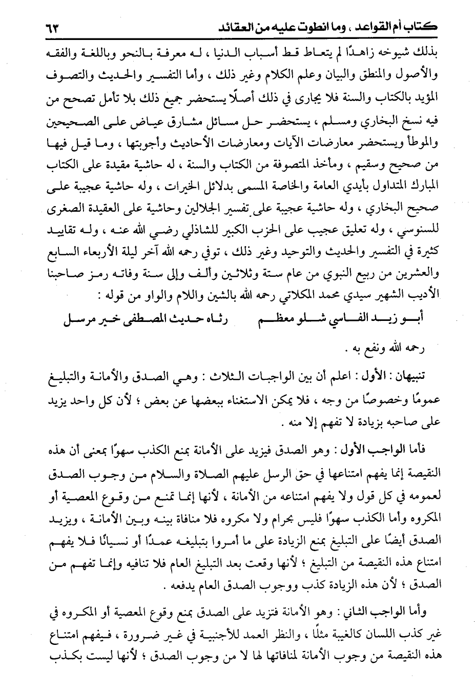 رحمه الله ونفع به (تنبيهان) الأول اعلم أن بين الواجبات الثلاث وهي الصدق والأمانة والتبليغ عموماً وخصوصاً من وجه فلايمكن الاستغناء ببعضها عن بعض لأن كل واحد يزيد على صاحبه بزيادة لاتفهم إلا منه فأما الواجب الأول وهو الصدق فيزيد على الأمانة بمنع الكذب سهواً بمعنى أن هذه النقيصة إنما يفهم امتناعها في حق الرسل عليهم الصلاة والسلام من وجوب الصدق لعمومه في كل قول ولايفهم امتناعه من الأمانة لأنها تمنع من وقوع المعصية أوالمكروه وأما الكذب سهواً فليس بحرام ولامكروه فلا منافاة بينه وبين الأمانة ويزيد الصدق أيضاً على التبليغ بمنع الزيادة على ماأمروا بتبليغه عمداً أونسياناً فلايفهم امتناع هذه النقيصة من التبليغ لأنها وقعت بعد التبليغ العام فلا تنافيه وإنما تفهم من الصدق لأن هذه الزيادة كذب ووجوب الصدق العام ينفعه وأما الواجب الثاني وهو الأمانة فتزيد على الصدق بمنع المعصية أوالمكروه في غير كذب اللسان كالغيبة مثلاً والنظر العمد للأجنبية في غير ضرورة فيفهم امتناع هذه النقيصة من وجوب الأمانة لمنافاتها لها لا من وجوب الصدق لأنها ليست بكذب