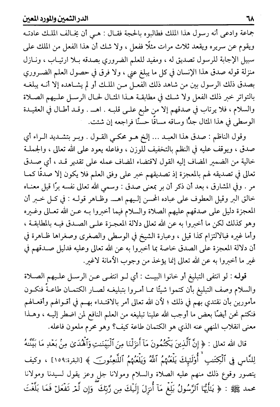 جماعة وادعى أنه رسول هذا الملك فطالبوه بالحجة فقال هي أن يخالف الملك عادته ويقوم عن سريره ويقعد ثلاث مرات مثلاً ففعل ولاشك أن هذا الفعل من الملك على سبيل الإجابة للرسول تصديق له ومفيد للعلم الضروري بصدقه بلاارتياب ونازل منزلة قوله صدق هذا الإنسان في كل مايبلغ عني ولافرق في حصول العلم الضروري بصدق ذلك الرسول بين من شاهد ذلك الفعل من الملك أو لم يشاهده إلا أنه يبلغه بالتواتر خبر ذلك الفعل ولاشك في مطابقة هذا المثال لحال الرسل عليهم الصلاة والسلام فلايرتاب في صدقهم إلا من طبع على قلبه اهـ وقد أطال في العقيدة الوسطى في هذا المثال جداً وساقه مساقاً حسناً فراجعه إن شئت. وقول الناظم صدق هذا العبد إلخ هو محكي القول وبر بتشديد الراء أي صدق ويوقف عليه في النظم بالتخفيف للوزن وفاعله يعود على الله تعالى والجملة خالية من الضمير المضاف إليه القول لاقتضاء المضاف عمله على تقدير قد أي صدق تعالى في تصديقه لهم بالمعجزة إذ تصديقهم خبر على وفق العلم فلايكون إلا صدقاً كما مر وفي المشارق بعدأن ذكر أن بر بمعنى صدق وسمي الله تعالى نفسه براً قيل معناه خالق البر وقيل العطوف على عباده المحسن إليهم اهـ وظاهر قوله في كل خبر أن المعجزة دليل على صدقهم عليهم الصلاة والسلام فيما أخبروا به عن الله تعالى وغيره وهو كذلك لكن ماأخبروا به عن الله تعالى دلالة المعجزة على الصدق فيه بالمطابقة وأماغيره فبالالتزام كذا قيل وعبارة الشيخ في الوسطى والصغرى وصغراها ظاهرة في أن دلالة المعجزة على الصدق خاصة بماأخبروا به عن الله تعالى وعليه فدليل صدقهم في غير ماأخبروا به عن الله تعالى إنما يؤخذ من وجوب الأمانة لاغير. قوله لو انتفى التبليغ أو خانوا البيت أي لو انتفى عن الرسل عليهم الصلاة والسلام وصف التبليغ بأن كتموا شيئاً مماأمروا بتبليغه لصار الكتمان طاعةً فنكون مأمورين بأن نقتدي بهم في ذلك لأن الله تعالى أمر بالاقتداء بهم في أقوالهم وأفعالهم فنكتم نحن أيضاً بعض ماأوجب الله علينا تبليغه من العلم النافع لمن اضطر إليه وهذا معنى انقلاب المنهي عنه الذي هو الكتمان طاعة كيف وهو محرم ملعون فاعله. قال الله تعالى {إن الذين يكتمون ماأنزلنا من البينات والهدى من بعد مابيناه للناس في الكتاب أولئك يلعنهم الله ويلعنهم اللاعنون} وكيف يتصور وقوع ذلك منهم عليه الصلاة والسلام ومولانا جل وعز يقول لسيدنا ومولانا محمد (ياأيها الرسول بلغ ماأنزل إليك من ربك وإن لم تفعل فما بلغت