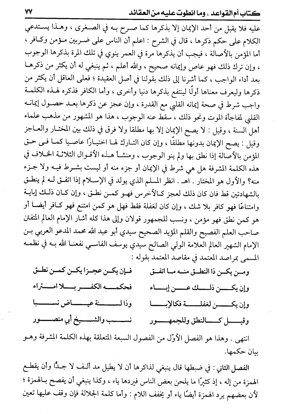 انتهى وهذا هو الفصل الأوّل من الفصول السبعة المتعلقة بهذه الكلمة المشرفة وهو بيان حكمها (من كان آخر كلامه لاإله إلاالله دخل الجنة) وقال أيضا (من مات وهو يعلم لاإله إلاالله دخل الجنة) فالأول فيمن يستطيع النطق والثاني فيمن لايستطيعه والله أعلم وقد ورد أن الملكين الكريمين يجتزيان منه بمجرد ذكرها حيث يمنعه مانع الهيبة والخوف من ذكر عقائد الإيمان لهما مفصلة اهـ باختصار وإذا كان ذكر هذه الكلمة المشرفة علامة للإيمان وترجمة عليه فلايقبل من أحد الإيمان إلابذكرها كماصرح به في الصغرى وهذا يستدعي الكلام على حكم ذكرها قال في الشرح اعلم أن الناس على ضربين مؤمن وكافر أماالمؤمن بالأصالة فيجب أن يذكرها مرة في العمر ينوي في تلك المرة بذكرها الوجوب وإن ترك ذلك فهو عاص وإيمانه صحيح والله أعلم ثم ينبغي له أن يكثر من ذكرها بعد أداء الواجب كماأشرنا إلى ذلك بقولنا في أصل العقيدة فعلى العاقل أن يكثر من ذكرها وليعرف معناها أولاً لينتفع بذكرها دنيا وأخرى وأماالكافر فذكره لهذه الكلمة واجب شرط في صحة إيمانه القلبي مع القدرة وإن عجز عن ذكرها بعد حصول إيمانه القلبي لمفاجأة الموت ونحو ذلك سقط عنه الوجوب هذا هو المشهور من مذهب علماء أهل السنة وقيل لايصح الإيمان إلابها مطلقا ولافرق في ذلك بين المختار والعاجز وقيل يصح الإيمان بدونها مطلقاً وإن كان التارك لها اختياراً عاصيا كمافى حق المؤمن بالأصالة إذا نطق بها ولم ينو الوجوب ومنشأ هذه الأقوال الثلاثة الخلاف في هذه الكلمة المشرفة هل هي شرط في الايمان أوجزء منه أوليست بشرط فيه ولاجزء منه والأول هو المختار اهـ انظر المسلم الذي يولد في الاسلام إذا اتفق له لم ينطق بالشهادتين قط فان كان ذلك لعجز كالأخرس فهو كمن نطق وإن كان ذلك إباية وامتناعاً فهو كافر بلاشك وإن كان لغفلة فقط فهل هو كمن امتنع فهو كافر أيضا أوهو كمن نطق فهو مؤمن ونسب للجمهور قولان وإلى هذا كله أشار الإمام العالم المتفتن صاحب العلم الفصيح والقلم المؤيد الصحيح سيدي أبوعبدالله محمد المدعو العربي بن الإمام الشهير العالم العلامة الولي الصالح سيدي يوسف الفاسي نفعنا الله به في نظمه المسمى بمراصد المعتمد في مقاصد المعتمد بقوله: