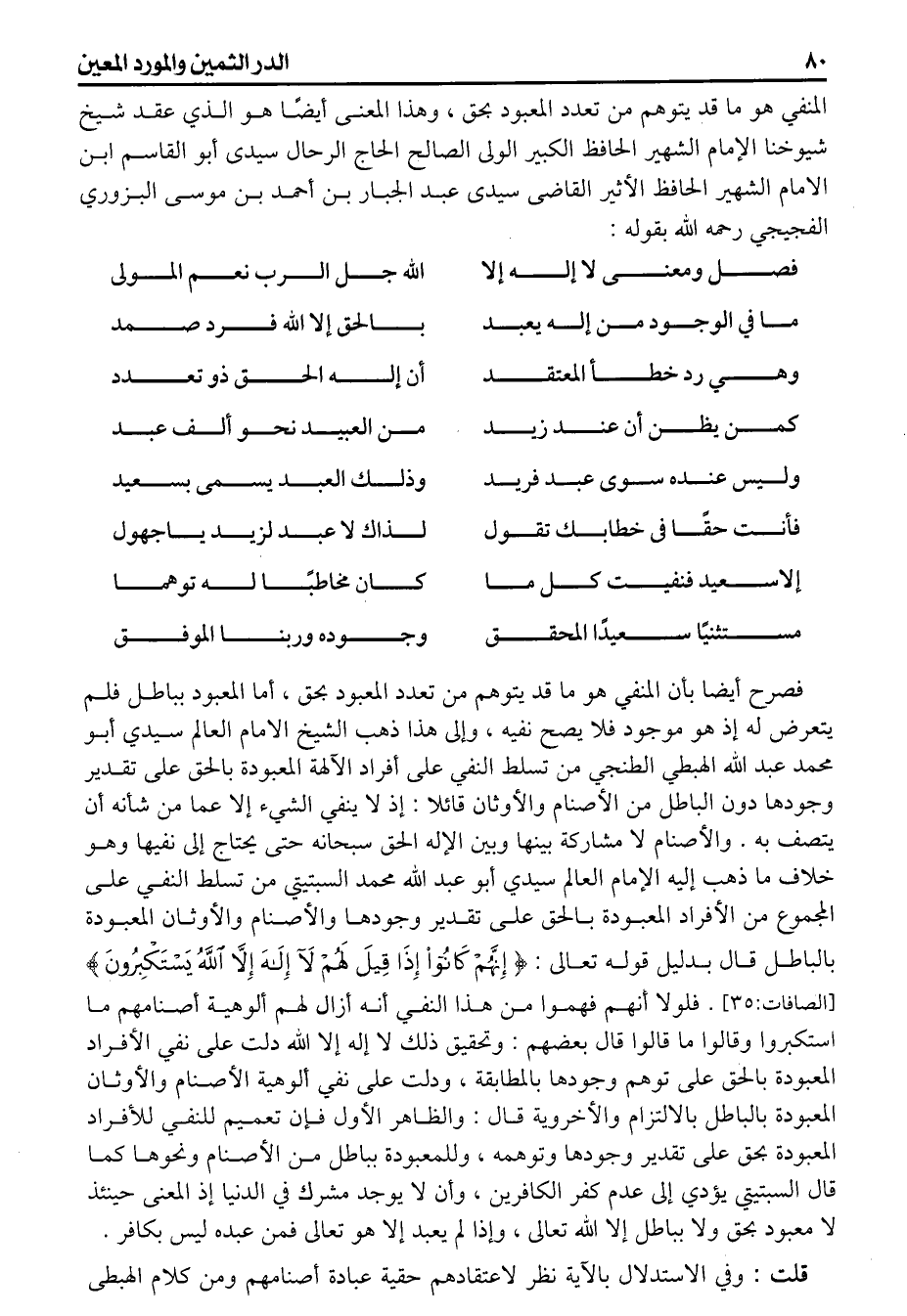 المنفي هو ماقد يتوهم من تعدد المعبود بحق وهذا المعنى أيضاً هو الذي عقد شيخ شيوخنا الإمام الشهير الحافظ الكبير الولى الصالح الحاج الرحال سيدى أبو القاسم ابن الامام الشهير الحافظ الأثير القاضى سيدى عبدالجبار بن أحمد بن موسى البزوري الفجيجي رحمه الله بقوله