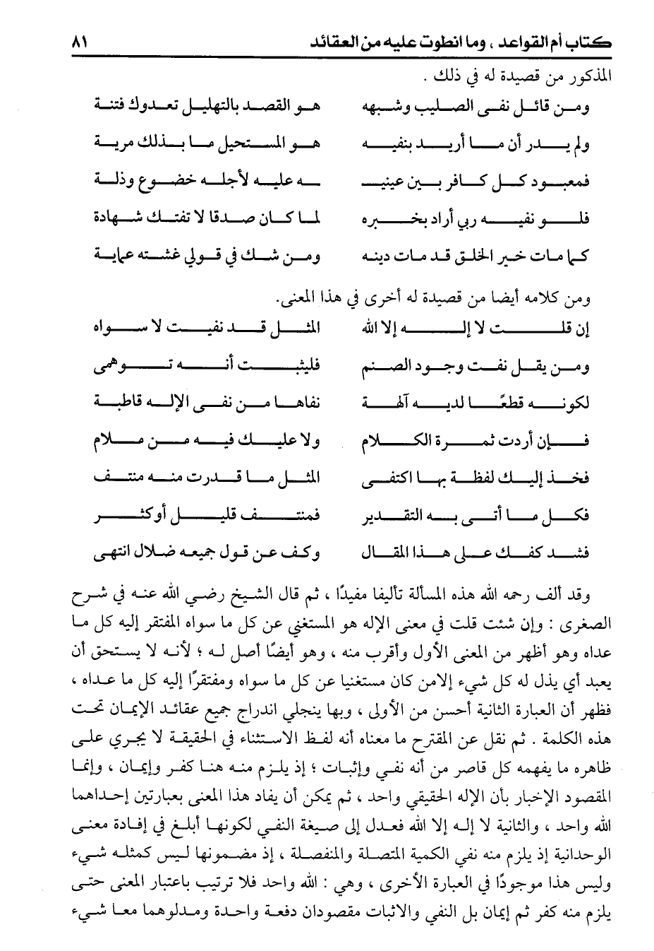 انتهى وقد ألف رحمه الله هذه المسئلة تأليفا مفيداً ثم قال الشيخ رضي الله عنه في شرح الصغرى وإن شئت قلت في معنى الإله هو المستغني عن كل ماسواه المفتقر إليه كل ماعداه وهو أظهر من المعنى الأول وأقرب منه وهو أيضاً أصل له لأنه لايستحق أن يعبد أي يدل له كل شيء إلامن كان مستغنيا عن كل ماسواه ومفتقراً إليه كل ماعداه فظهر أن العبارة الثانية أحسن من الأولى وبها ينجلي اندراج جميع عقائد الإيمان تحت هذه الكلمة ثم نقل عن المقترح مامعناه أنه لفظ الاستثناء في الحقيقة لايجري على ظاهره مايفهمه كل قاصر من أنه نفي وإثبات إذ يلزم منه هنا كفر وإيمان وإنما المقصود الإخبار بأن الإله الحقيقي واحد ثم يمكن أن يفاد هذا المعنى بعبارتين إحداهماالله واحد والثانية لاإله إلاالله فعدل إلى صيغة النفي لكونها أبلغ في إفادة معنى الوحدانية إذ يلزم منه نفي الكمية المتصلة والمنفصلة إذ مضمونها ليس كمثله شيء وليس هذا موجوداً في العبارة الأخرى وهي الله واحد فلاترتيب باعتبار المعنى حتى يلزم منه كفر ثم إيمان النفي والاثبات مقصودان دفعة واحدة ومدلوهما معا شيء