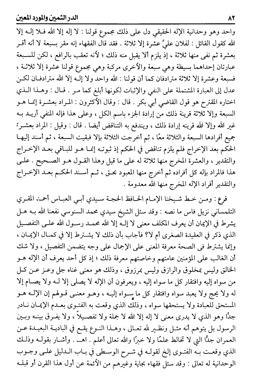 واحد وهو وحدانية الإله الحقيقي دل على ذلك مجموع قولنا لاإله إلاالله فلاإله إلاالله كقول القائل لفلان علي عشرة إلاثلاثة فقد قال الفقهاء إنه مقر بسبعة لاأنه أقر بعشرة ثم نفى منها ثلاثة إذ يلزم أن يقبل منه ذلك لأنه تعقب بالرافع لكن للسبعة عبارتان إحداهما بسيطة وهي سبعة والأخرى مركبة وهي مجموع قولنا عشرة إلاثلاثة فسبعة وعشرة إلاثلاثة مترادفان كماأن قولنا الله واحد ولاإله إلاالله مترادفان لكن عدل إلى العبارة المشتملة على النفي والإثبات لكونها أبلغ كمامر قال وهذا الذي اختاره المقترح هو قول القاضي أبي بكر قال وقال الأكثرون المراد بعشرة إنماهو السبعة وإلاثلاثة قرينة ذلك من إرادة الجزء باسم الكل وعلى هذا فاله المنفي أريد به غير الله وإلا الله قرينه إرادة ذلك ويندفع به التناقض أيضا قال وقيل المراد بعشرة جميع أفرادها السبعة والثلاثة معا ثم أخرجت الثلاثة بإلافبقيت السبعة ثم أسند إليها الحكم بعد الإخراج فلم يلزم تناقض في الحكم إذ ثبوته إنما هو للباقي بعد الإخراج والتقدير والعشرة المخرج منهاثلاثة له على ماقيل وهذا القول هو الصحيح على هذا فالمراد بإله كل أفراده ثم أخرج منها المعبود بحق ثم أسند الحكم بعد الإخراج والتقدير أفراد الإله المخرج منها الله معدومة (فرع) ومن خط شيخنا الإمام الحافظ الحجة سيدي أبي العباس أحمد المقري التلمساني نزيل فاس مانصه وقد سئل الشيخ سيدي محمد السنوس نفعناالله به هل يشرط في الإيمان أن يعرف المكلف معنى لاإله إلا الله محمد رسول الله على التفصيل الذي ذكرى في العقيدة الصغرى أم لا؟ فأجاب بأن ذلك لايشترط إلافي كمال الإيمان وإنمايشترط فى الصحة معرفة المعنى على الإجمال على وجه يتضمن التفصيل ولاشك أن الغالب على المؤمنين عامتهم وخاصتهم معرفة ذلك إذ كل أحد يعرف أن الإله هو الخالق وليس بمخلوق والرازق وليس بمرزوق وذلك هو معنى غناه جل وعز عن كل من سواه اليه وافتقار كل ماسواه إليه ويعرفون أن الإله لايصلى الاله ولايصام إلاله ولايحج ولايعبد سواه وافتقار كل ماسواه إليه وهو معنى قولهم إن الإله هو المستحق للعبادة ولايستحقها سواه وذلك الذي وقعت به الفتوى بعدم الإيمان نادر جداً وهو الذي لايدرى معنى لاإله إلاالله لاجملة ولاتفصيلاً ولايفرق بينه وبين الرسول بل يتوهم أنه متل ونظير لله تعالى وهذا النوع يقع في البادية البعيدة عن العمران جدا التي لاتخالط علما ولاخبرا والله تعالى أعلم اهـ وأشار بقوله وذلك الذي وقعت به الفتوى الخ لقوله في شرح الوسطى في باب الدليل على وجوب الوحدانية له تعالى وقد سئل فقهاء بجاية وغيرهم من الأئمة عن أول هذا القرن أو قبله