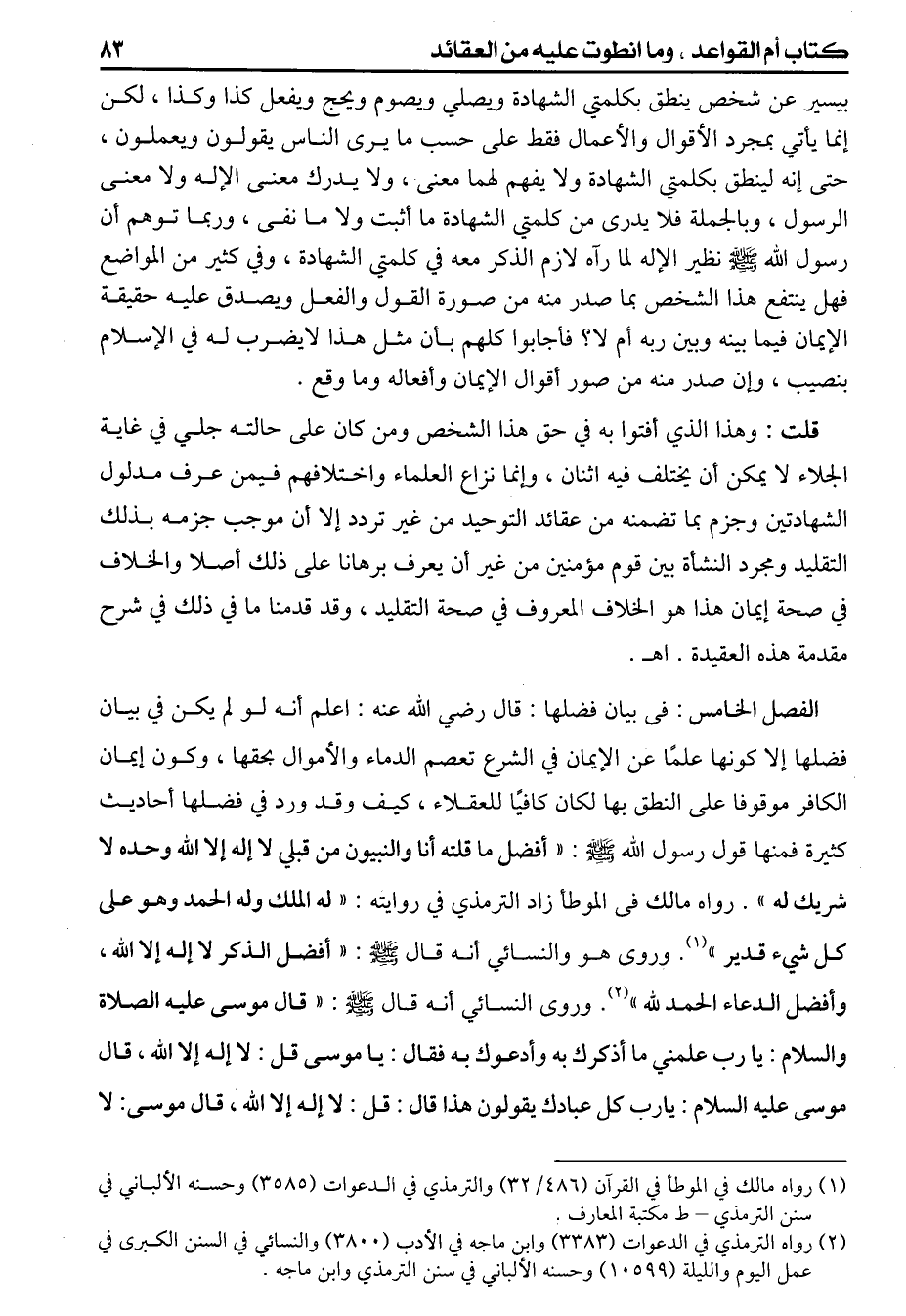 قال رضي الله عنه اعلم أنه لولم يكن في بيان فضلها إلاكونها علماً عن الإيمان في الشرع تعصم الدماء والأموال بحقها وكون إيمان الكافر موقوفا على النطق بها لكان كافياً للعقلاء كيف وقد ورد في فضلها أحاديث كثيرا فمنها قول رسول الله «أفضل ماقلته أناوالنبيون من قبلي لاإله الاالله وحده لاشريك له» رواه مالك فى الموطأ زاد الترمذي في روايته له الملك وله الحمد وهو على كل شىء قدير وروى هو والنسائي أنه قال (أفضل الذكر لااله الاالله وأفضل الدعاء الحمدلله) وروى النسائي أنه قال «قال موسى عليه الصلاة والسلام يارب علمني ماأذكرك به وأدعوك به فقال ياموسى قل لاإله الاالله قال موسى عليه السلام يارب كل عبادك يقولون هذا قال قل لاإله إلاالله قال موسى: لا
