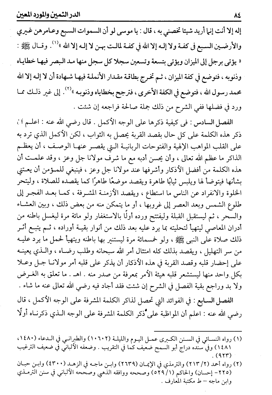 فى كيفية ذكرها على الوجه الأكمل قال رضي الله عنه اعلم أن ذكر هذه الكلمة على كل حال بقصد القربة يحصل به الثواب لكن الأكمل الذي ترد به على القلب المواهب الإلهية والفتوحات الربانية التي يقصر عنها الوصف أن يعظم الذاكر ماعظم الله تعالى وأن يحسن أدبه مع ماشرف مولانا جل وعز وقد علمت أن هذه الكلمة من أفضل الأذكار وأشرفها عند مولانا جل وعز فينبغي للمؤمن أن يعتني بشأنها فيتوضأ لها ويلبس ثيابا طاهرة ويقصد موضعا طاهرا كمايقصده للصلاة وليتحر الخلوة والإنفراد عن الناس مااستطاع ويقصد الأزمنة المشرفة كمابعد الفجر إلى طلوع الشمس وبعد العصر إلى غروبها أومايتمكن منه من بعض ذلك وبين العشاء والسحر ثم ليستقبل القبلة وليفتتح ورده أولا بالاستغفار ولو مائة مرة ليغسل باطنه من أدران المعاصي ليتهيأ لتحليته بمايرد عليه بعد ذلك من أنوار بقية أوراده ثم يتبع أثر ذلك صلاة على النبى ولوخمسمائة مرة ليستنير بها باطنه ويتهيأ لحمل مايرد عليه من سر التهليل ويقصد بذلك كله امتثال أمر الله سبحانه وطلب رضاه والذي يعينه على احضار قلبه وقصد القربة في هذه الأذكار أن يذكر على قلبه أمر مولانا جل وعلا بكل واحد منها ليستشعر قلبه هيئة الأمر بمعرفة من صدر منه اهـ ماتعلق به الغرض ولابد وراجع بقية الفصل في الشرح إن شئت فقد أجاد فيه رضي الله تعالى عنه ماشاء