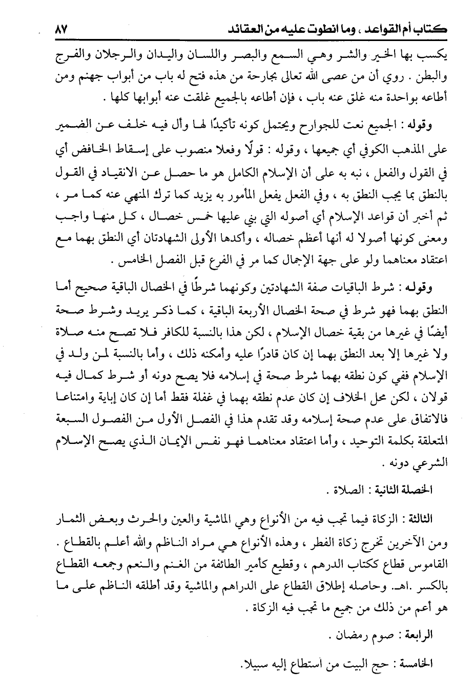 يكسب بها الخير والشر وهي السمع والبصر واللسان واليدان والرجلان والفرج والبطن روي أن من عصى الله تعالى بجارحة من هذه فتح له باب من أبواب جهنم ومن أطاعه بواحدة منه غلق عنه باب فإن أطاعه بالجميع غلقت عنه أبوابها كلها* وقوله الجميع نعت للجوارح ويحتمل كونه تأكيداً لها وأل فيه خلف عن الضمير على المذهب الكوفي أي جميعها وقوله قولا وفعلا منصوب على إسقاط الخافض أي في القول والفعل نبه به على أن الإسلام الكامل هو ماحصل عن الانقياد في القول بالنطق بمايجب النطق به وفي الفعل يفعل المأمور به يزيد كماترك المنهي عنه كمامر ثم أخبر أن قواعد الإسلام أي أصوله التي بني عليها خمس خصال كل منها واجب ومعنى كونها أصولا له أنها أعظم خصاله وآكدها الأولى الشهادتان أي النطق بهما مع اعتقاد معناهما ولو على جهة الإجمال كمامر في الفرع قبل الفصل الخامس وقوله شرط الباقيات صفة الشهادتين وكونهما شرطاً في الخصال الباقية صحيح أماالنطق بهما فهو شرط في صحة الخصال الأربعة الباقية كماذكر يريد وشرط صحة أيضاً في غيرها من بقية خصال الإسلام لكن هذا بالنسبة للكافر فلاتصح منه صلاة ولاغيرها إلابعد النطق بهما إن كان قادراً عليه وأمكنه ذلك وأمابالنسبة لمن ولد في الإسلام ففي كون نطقه بهما شرط صحة في إسلامه فلايصح دونه أوشرط كمال فيه قولان لكن محل الخلاف إن كان عدم نطقه بهما في غفلة فقط أماإن كان إباية وإمتناعا فالاتفاق على عدم صحة إسلامه وقد تقدم هذا في الفصل الاول من الفصول السبعة المتعلقة بكلمة التوحيد وأمااعتقاد معناهما فهو نفس الإيمان الذي يصح الإسلام الشرعي دونه (الخصلة الثانية) الصلاة (الثالثة) الزكاة فيماتجب فيه من الأنواع وهي الماشية والعين والحرث وبعض الثمار ومن الأخرين تخرج زكاة الفطر وهذه الأنواع هي مراد الناظم والله أعلم بالقطاع القاموس قطاع ككتاب الدرهم وقطيع كأمير الطائفة من الغنم والنعم وجمعه القطاع بالكسر اهـ وحاصله إطلاق القطاع على الدراهم والماشية وقد أطلقه الناظم على ماهو أعم من ذلك من جميع ماتجب فيه الزكاة (الرابعة) صوم رمضان (الخامسة) حج البيت من استطاع إليه سبيلا.