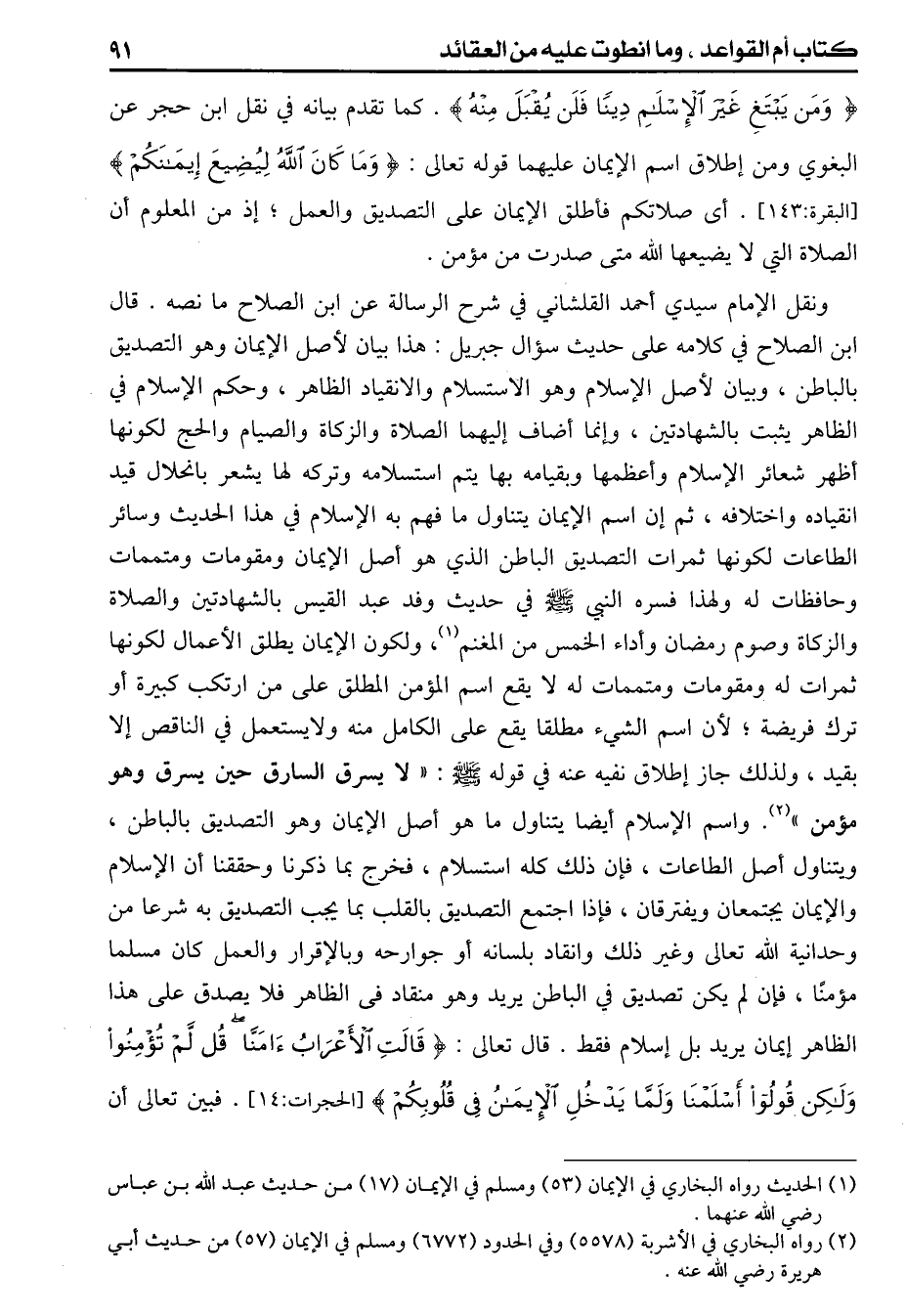 {ومن يبتغ غير الإسلام دينا فلن يقبل منه} كما تقدم بيانه في نقل ابن حجر عن البغوي ومن إطلاق اسم الإيمان عليهما قوله تعالى {وما كان الله ليضيع إيمانكم} أى صلاتكم فأطلق الإيمان على التصديق والعمل إذ من المعلوم أن الصلاة التي لايضيعها الله متى صدرت من مؤمن ونقل الامام سيدي أحمد القلشاني في شرح الرسالة عن ابن الصلاح مانصه قال ابن الصلاح في كلامه على حديث سؤال جبريل هذا بيان لأصل الإيمان وهو التصديق بالباطن وبيان لأصل الإسلام وهو الاستسلام والانقياد الظاهر وحكم الإسلام في الظاهر يثبت بالشهادتين وإنما أضاف إليهما الصلاة والزكاة والصيام والحج لكونها أظهر شعائر الإسلام وأعظمها وبقيامه بها يتم استسلامه وتركه لهايشعر بانحلال قيد انقياده واختلافه ثم إن اسم الإيمان يتناول مافهم به الإسلام في هذا الحديث وسائر الطاعات لكونها ثمرات التصديق الباطن الذي هو أصل الإيمان ومقومات ومتممات وحافظات له ولهذا فسره النبي في حديث وفد عبد القيس بالشهادتين والصلاة والزكاة وصوم رمضان وأداء الخمس من المغنم ولكون الإيمان يطلق الأعمال لكونها ثمرات له ومقومات ومتممات له لايقع اسم المؤمن المطلق على من ارتكب كبيرة أوترك فريضة لأن اسم الشيء مطلقا يقع على الكامل منه ولايستعمل في الناقص إلابقيد ولذلك جاز إطلاق نفيه عنه في قوله «لايسرق السارق حين يسرق وهو مؤمن» واسم الإسلام أيضا يتناول ماهو أصل الإيمان وهو التصديق بالباطن ويتناول أصل الطاعات فإن ذلك كله استسلام فخرج بما ذكرنا وحققنا أن الإسلام والإيمان يجتمعان ويفترقان فإذا اجتمع التصديق بالقلب بمايجب التصديق به شرعا من وحدانية الله تعالى وغير ذلك وانقاد بلسانه أوجوارحه وبالإقرار والعمل كان مسلما مؤمنا فان لم يكن تصديق في الباطن يريد وهو منقاد فى الظاهر فلا يصدق على هذا الظاهر إيمان يريد بل إسلام فقط قال تعالى {قالت الأعراب آمنا قل لم تؤمنوا ولكن قولوا أسلمنا ولما يدخل الإيمان في قلوبكم} فبين تعالى أن