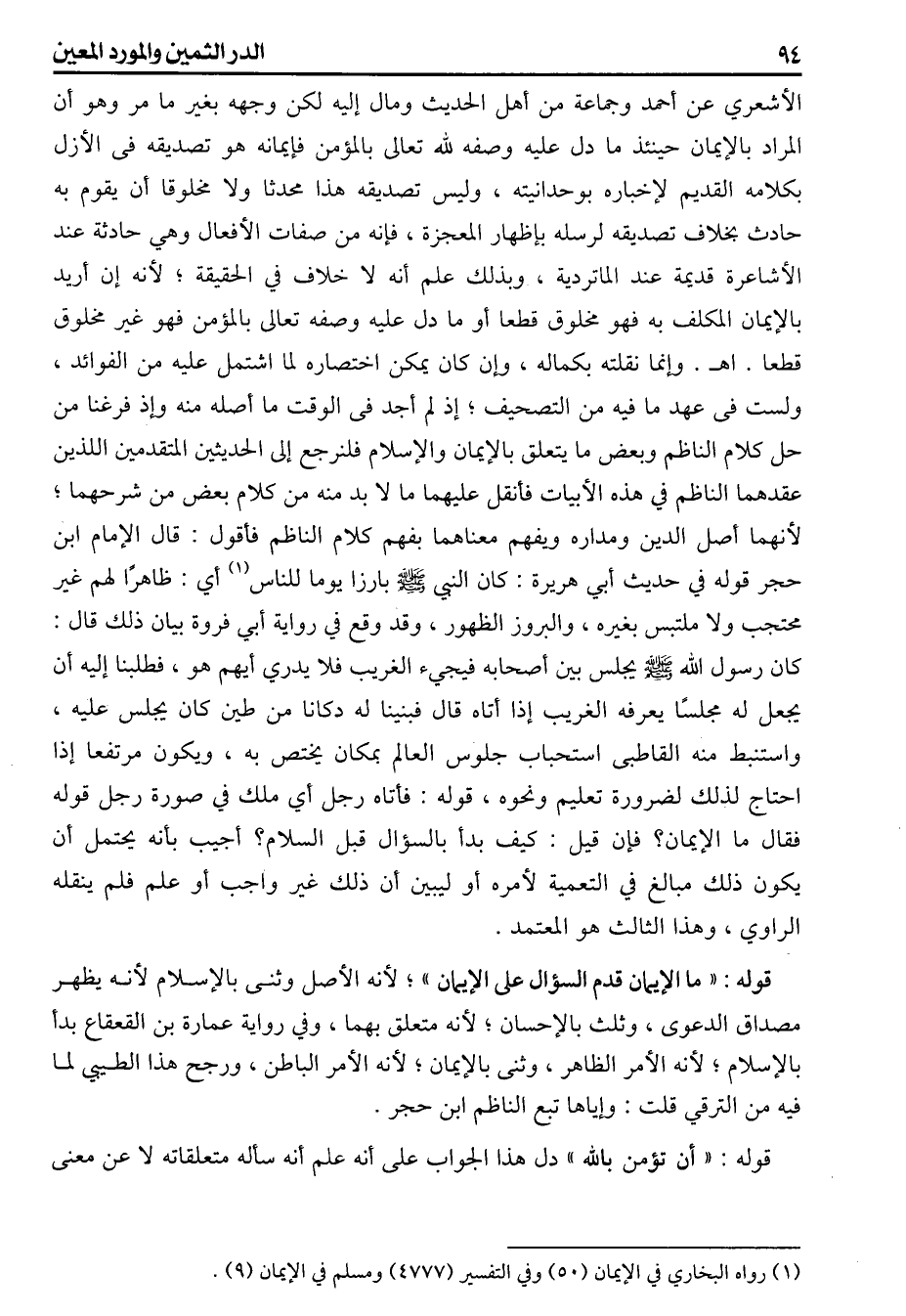 الأشعري عن أحمد وجماعة من أهل الحديث ومال إليه لكن وجهه بغير مامر وهو أن المراد بالإيمان حينئذ مادل عليه وصفه لله تعالى بالمؤمن فايمانه هو تصديقه فى الأزل بكلامه القديم لإخباره بوحدانيته وليس تصديقه هذا محدثا ولامخلوقا أن يقوم به حادث بخلاف تصديقه لرسله بإظهار المعجزة فإنه من صفات الأفعال وهي حادثة عند الأشاعرة قديمة عند الماتردية وبذلك علم أنه لاخلاف في الحقيقة لأنه إن أريد بالإيمان المكلف به فهو مخلوق قطعا أومادل عليه وصفه تعالى بالمؤمن فهو غير مخلوق قطعا اهـ وإنما نقلته بكماله وإن كان يمكن اختصاره لما اشتمل عليه من الفوائد ولست فى عهد مافيه من التحصيف إذ لم أجد فى الوقت ماأصله منه وإذ فرغنا من حل كلام الناظم وبعض مايتعلق بالإيمان والإسلام فلنرجع إلى الحديثين المتقدمين اللذين عقدهما الناظم في هذه الأبيات فأنقل عليهما مالابد منه من كلام بعض من شرحهما لأنهما أصل الدين ومداره ويفهم