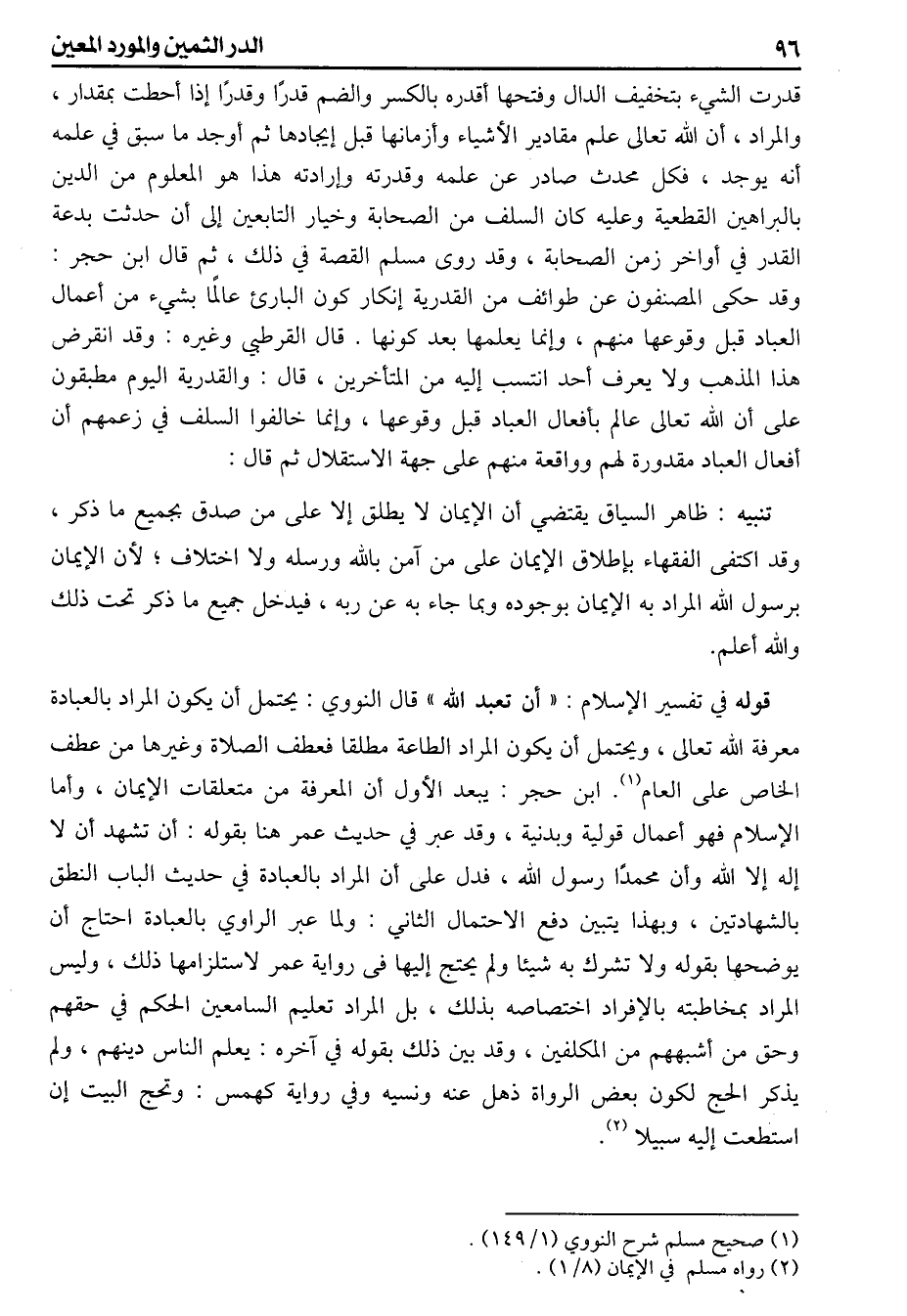 قدرت الشيء بتخفيف الدال وفتحها أقدره بالكسر والضم قدرا إذا أحطت بمقدار والمراد أن الله تعالى علم مقادير الأشياء وأزمانها قبل إيجادها ثم أوجد ماسبق في علمه أنه يوجد فكل محدث صادر عن علمه وقدرته وإرادته هذا هو المعلوم من الدين بالبراهين القطيعة وعليه كان السلف من الصحابة وخيار التابعين إلى أن حدثت بدعة القدر في أواخر زمن الصحابة وقد روى مسلم القصة في ذلك ثم قال ابن حجر وقد حكى المصنفون عن طوائف من القدرية إنكار كون البادىء عالما بشيء من أعمال العباد قبل وقوعها منهم وإنما يعلمها بعد كونها قال القرطبي وغيره وقد انقرض هذا المذهب ولايعرف أحد انتسب إليه من المتأخرين قال والقدرية اليوم مطبقون على أن الله تعالى عالم بأفعال العباد قبل وقوعها وإنما خالفوا السلف في زعمهم أن أفعال العباد مقدورة لهم وواقعة منهم على جهة الاستقلال ثم قال (تنبيه) ظاهر السياق يقتضي أن الإيمان لايطلق إلاعلى من صدق بجميع ماذكر وقد اكتفى الفقهاء بإطلاق الإيمان على من آمن بالله ورسله ولااختلاف لأن الإيمان برسول الله المراد به الإيمان بوجوده وبما جاء به عن ربه فيدخل جميع ماذكر تحت ذلك والله أعلم* قوله في تفسير الإسلام أن تعبد الله قال النووي يحتمل أن يكون المراد بالعبادة معرفة الله تعالى ويحتمل أن يكون المراد الطاعة مطلقا فعطف الصلاة وغيرها من عطف الخاص على العام ابن حجر يبعد الأول أن المعرفة من متعلقات الإيمان وأما الإسلام فهو أعمال قولية وبدنية وقد عبر في حديث عمر هنا بقوله أن تشهد أن لاإله إلاالله وأن محمداً رسول الله فدل على أن المراد بالعبادة في حديث الباب النطق بالشهادتين وبهذا يتبين دفع الاحتمال الثاني ولماعبر الراوي بالعبادة احتاج أن يوضحها بقوله ولاتشرك به شيئا ولم يحتج إليها فى رواية عمر لاستلزامها ذلك وليس المراد بمخاطبته بالإفراد اختصاصه بذلك بل المراد تعليم السامعين الحكم في حقهم وحق من أشبههم من المكلفين وقد بين ذلك بقوله في آخره يعلم الناس دينهم ولم يذكر الحج لكون بعض الرواة ذهل عنه ونسيه وفي رواية كهمس وتحج البيت إن استطعت ءليه سبيلا