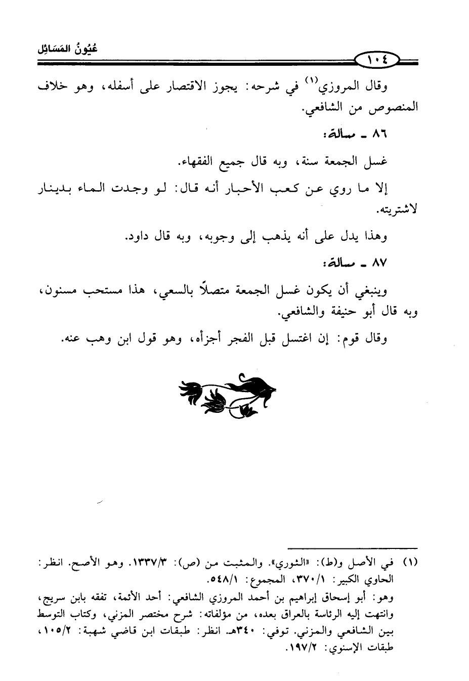 (¬1) في الأصل و (ط): "الثّوريّ". والمثبت من (ص): 3/ 1337 وهو الأصح. انظر: الحاوي الكبير: 1/ 370، المجموع: 1/ 548.