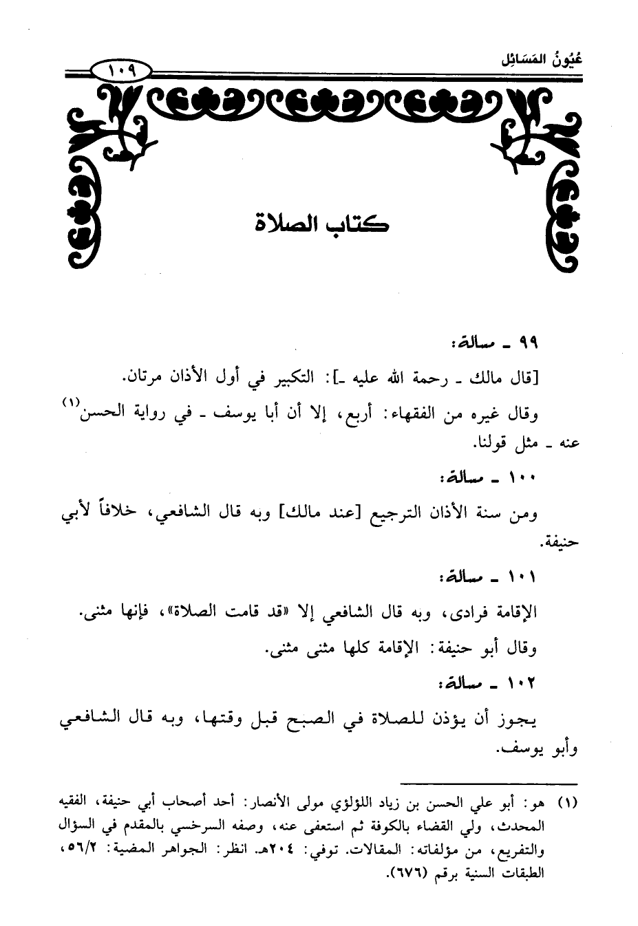 (¬1) هو: أبو علي الحسن بن زياد اللؤلؤي مولى الأنصار: أحد أصحاب أبي حنيفة، الفقيه المحدث، ولي القضاء بالكوفة ثمّ استعفى عنه، وصفه السرخسي بالمقدم في السؤال والتفريع، من مؤلفاته: المقالات. توفي: 204 هـ. انظر: الجواهر المضية: 2/ 56، الطبقات السنية برقم (676).