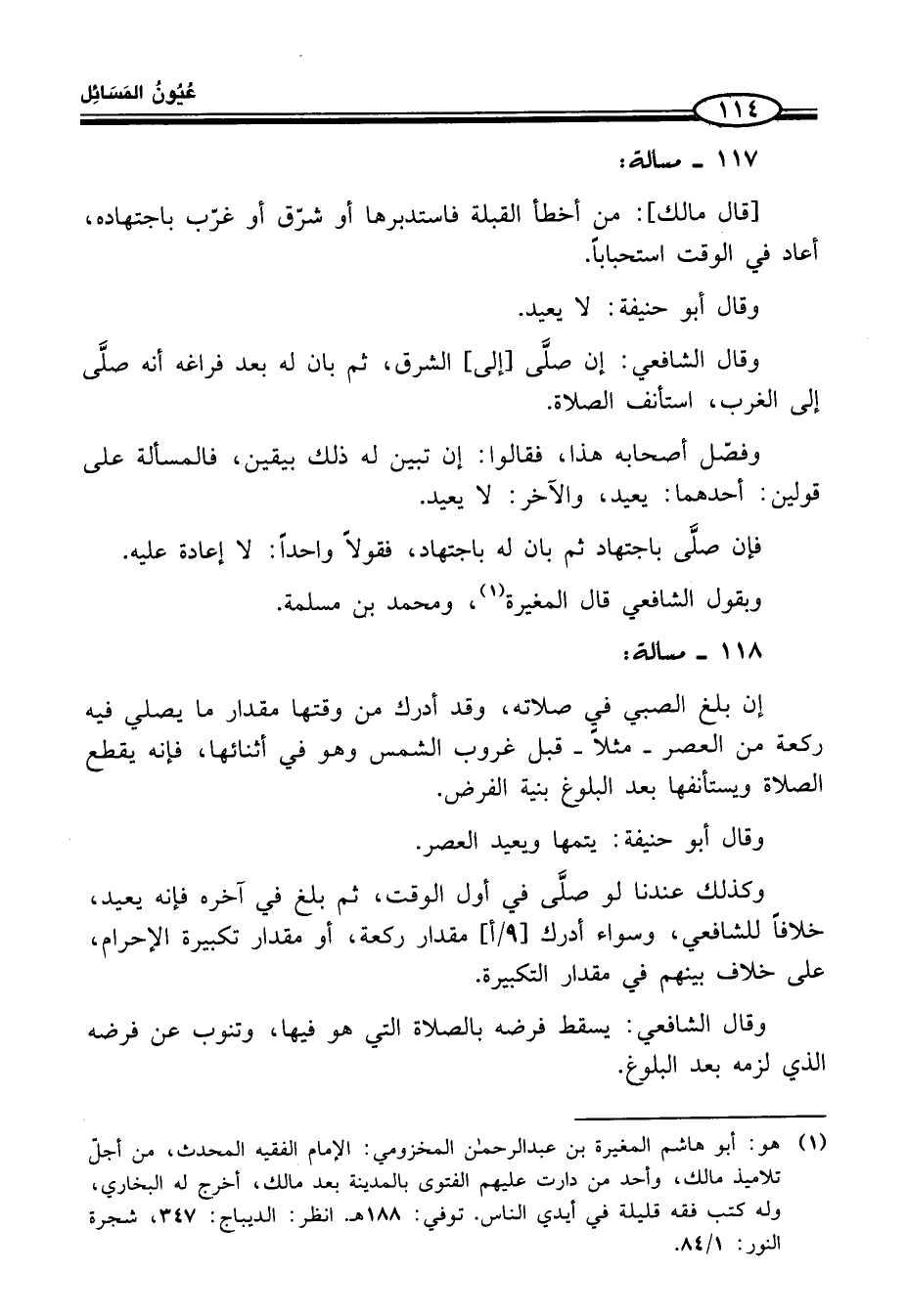 (¬1) هو: أبو هاشم المغيرة بن عبد الرّحمن المخزومي: الإمام الفقيه المحدث، من أجلّ تلاميذ مالك، وأحد من دارت عليهم الفتوى بالمدينة بعد مالك، أخرج له البخاريّ، وله كتب فقه قليلة في أيدي النَّاس. توفي: 188 هـ. انظر: الديباج: 347، شجرة النور: 1/ 84.