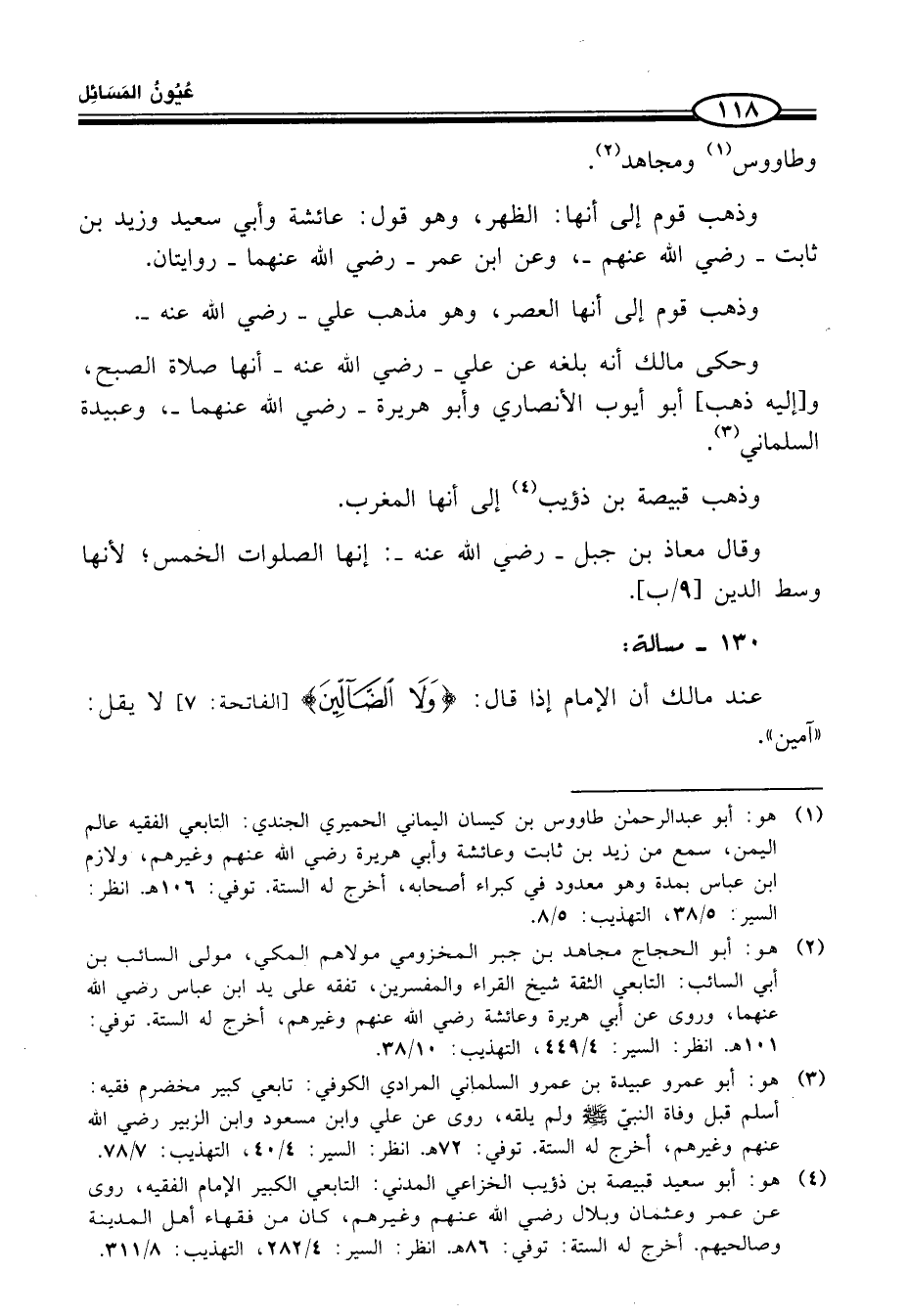 (¬3) هو: أبو عمرو عبيدة بن عمرو السلمإني المرادي الكوفي: تابعي كبير مخضرم فقيه: أسلم قبل وفاة النبيّ - صلّى الله عليه وسلم - ولم يلقه، روى عن علي وابن مسعود وابن الزبير رضي الله عنهم وغيرهم، أخرج له الستة. توفي: 72 هـ. انظر: السير: 4/ 40، التهذيب: 7/ 78.
