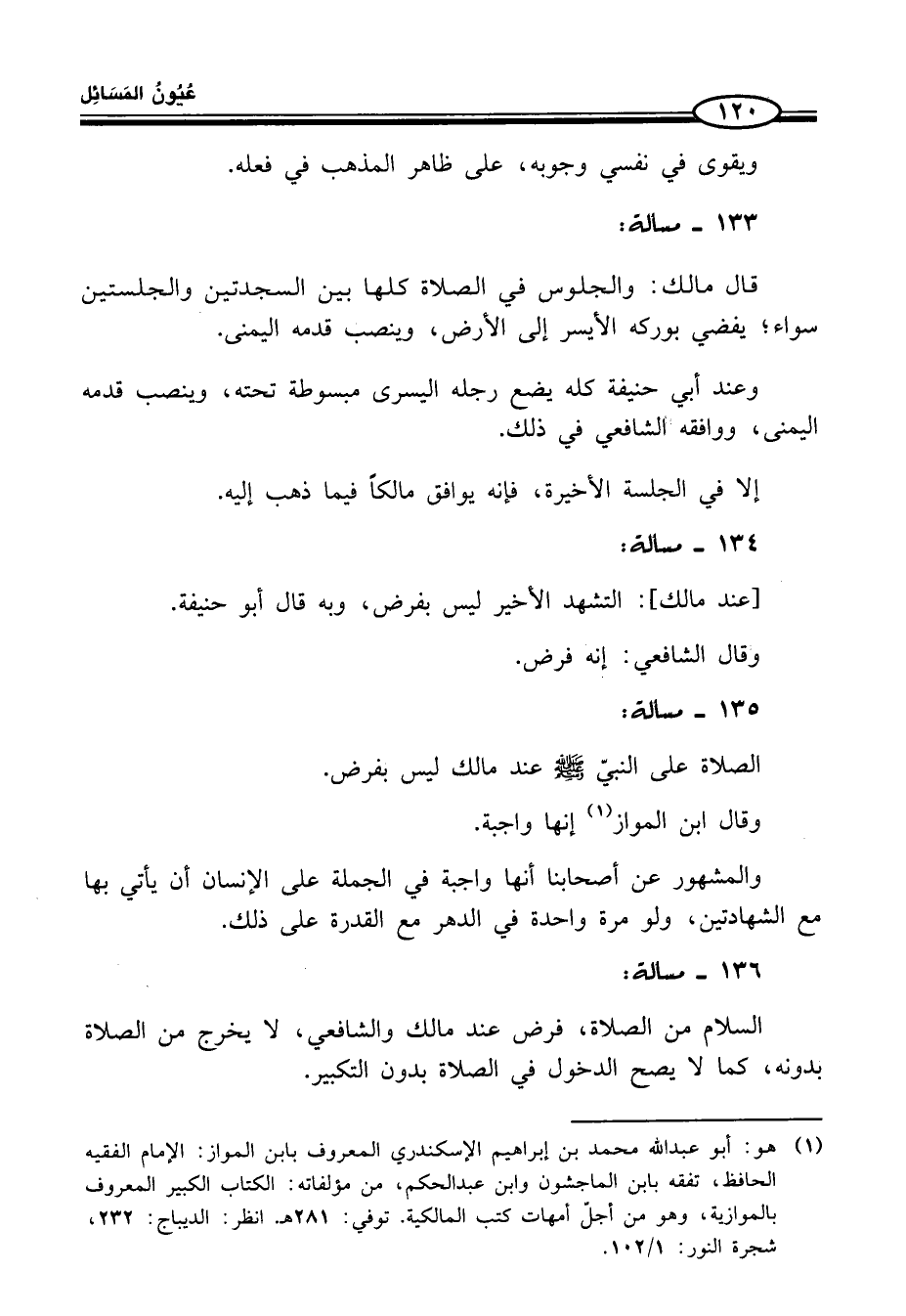 (¬1) هو: أبو عبد الله محمَّد بن إبراهيم الإسكندري المعروف بابن الموّاز: الإمام الفقيه الحافظ، تفقه بابن الماجثون وابن عبد الحكم، من مؤلفاته: الكتاب الكبير المعروف بالموّازية، وهو من أجل أمهات كتب المالكية. توفي: 281 هـ. انظر: الديباج: 232، شجرة النور: 1/ 102.