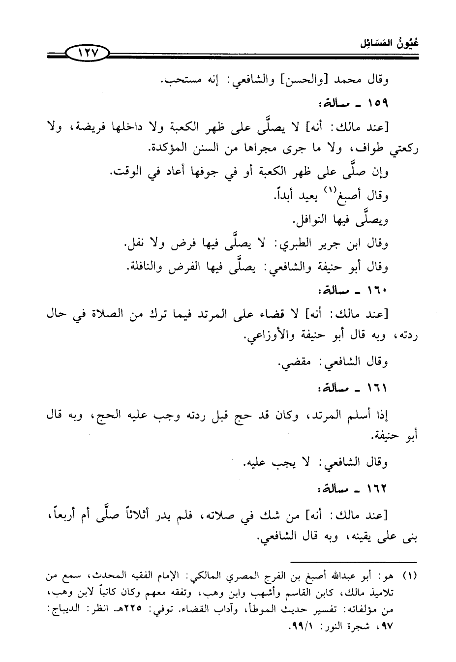 (¬1) هو: أبو عبد الله أصبغ بن الفرج المصري المالكي: الإمام الفقيه المحدث، سمع من تلاميذ مالك، كابن القاسم وأشهب وابن وهب، وتفمْه معهم وكان كاتبًا لابن وهب، من مؤلفاته: تفسير حديث الموطَّأ، وآداب القضاء. توفي: 225 هـ. انظر: الدبباج: 97، شجرة النور: 1/ 99.