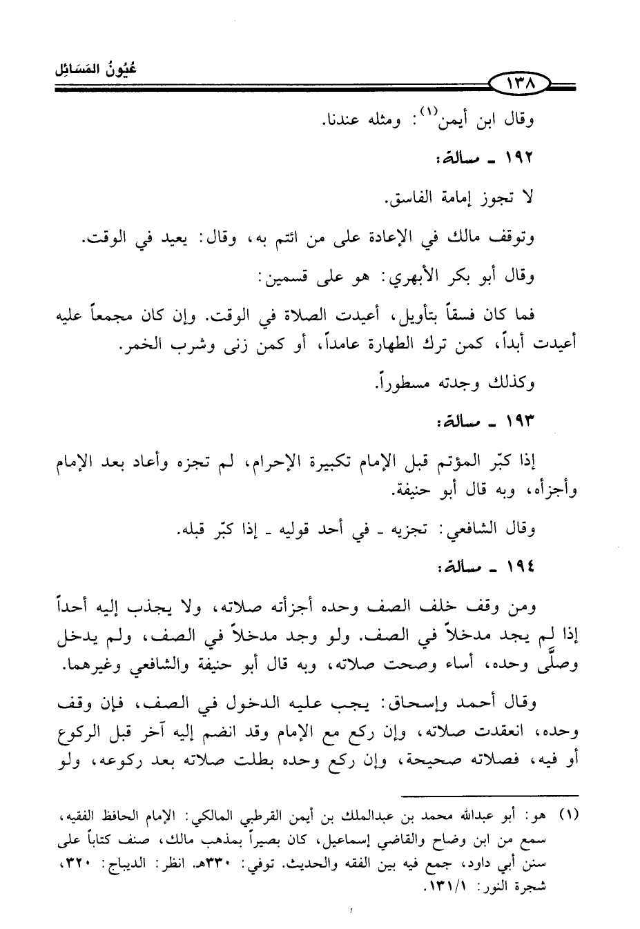 (¬1) هو: أبو عبد الله محمَّد بن عبد الملك بن أيمن القرطبي المالكي: الإمام الحافظ الفقيه، سمع من ابن وضاح والقاضي إسماعيل، كان بصيرًا بمذهب مالك، صنف كتابًا على سنن أبي داود، جمع فيه بين الفقه والحديث. توفي: 330 هـ. انظر: الديباج: 320، شجرة النور: 1/ 131.