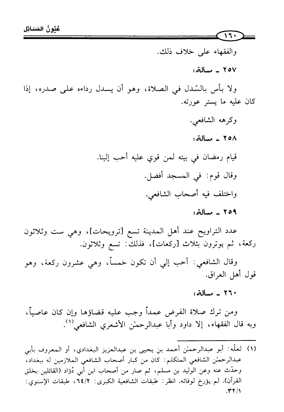 (¬1) لعلّه: أبو عبد الرّحمن أحمد بن يحيى بن عبد العزيز البغدادي، أو المعروف بأبي عبد الرّحمن الشّافعيّ المتكلم: كان من كبار أصحاب الشّافعيّ الملازمين له ببغداد، وحدّث عنه وعن الوليد بن مسلم، ثمّ صار من أصحاب ابن أبي دُؤاد (القائلين بخلق القرآن). لم يؤرخ لوفاته. انظر: طبقات الشّافعيّة الكبرى: 2/ 64، طبقات الأسنوي: 1/ 32.