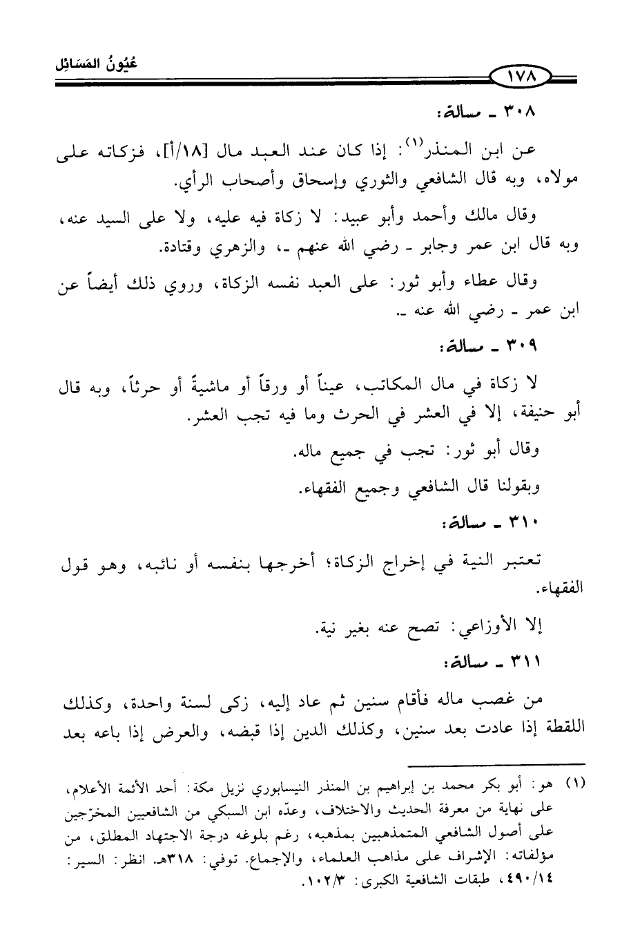(¬1) هو: أبو بكر محمّد بن إبراهيم بن المنذر النيسابوري نزيل مكّة: أحد الأئمة الأعلام، على نهاية من معرفة الحديث والاختلاف، وعده ابن السبكي من الشّافعيّين المخرّجين على أصول الشّافعيّ المتمذهبين بمذهبه، رغم بلوغه درجة الاجتهاد المطلق، من مؤلفاته: الإشراف على مذاهب العلماء، والإجماع. توفي: 318 هـ. انظر: السير: 14/ 490، طبقات الشّافعيّة الكبرى: 3/ 102.