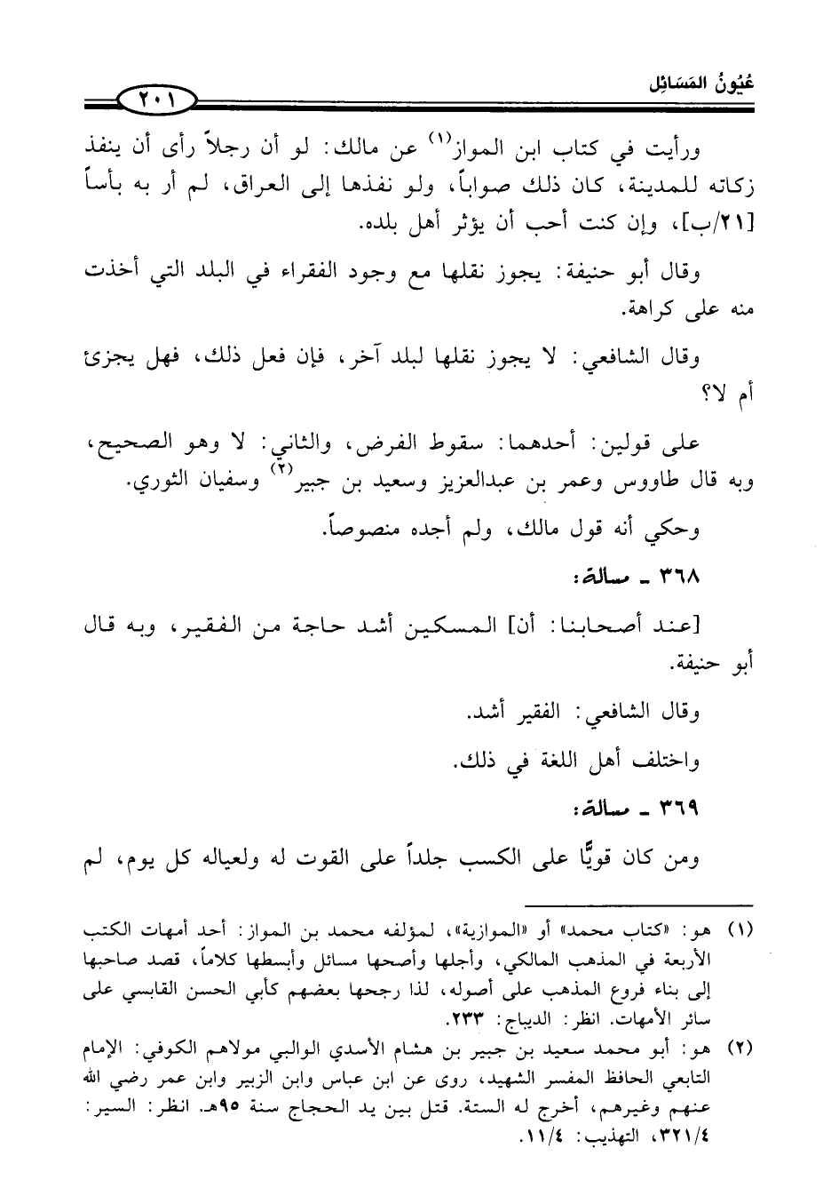 ورأيت في كتاب ابن الموّاز (¬1) عن مالك: لو أن رجلًا رأى أن ينفذ زكاته للمدينة، كان ذلك صوابًا، ولو نفذها إلى العراق، لم أر به بأسًا [21/ب]، وإن كنت أحب أن يؤثر أهل بلده.