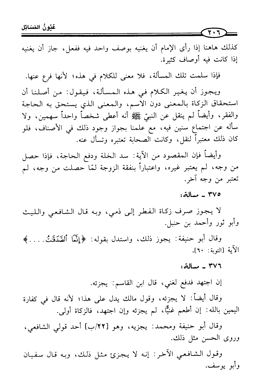 ويجوز أن يغير الكلام في هذه المسألة، فيقول: من أصلنا أن استحقاق الزَّكاة بالمعنى دون الاسم، والمعنى الّذي يستحق به الحاجة والفقر، وأيضًا لم ينقل عن النّبيّ - صلّى الله عليه وسلم - أنّه أعطى شخصًا واحدًا سهمين، ولا سأله عن اجتماع سنين فيه، مع علمنا بجواز وجود ذلك في الأصناف، فلو كان ذلك معتبرًا لنقل، وكانت الصّحابة تعتبره وتسأل عنه.