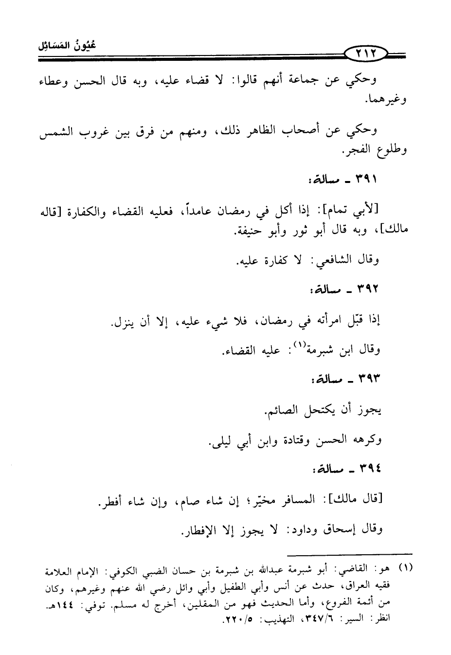 (¬1) هو: القاضي: أبو شبرمة عبد الله بن شبرمة بن حسان الضبي الكوفي: الإمام العلّامة فقيه العراق، حدث عن أنس وأبي الطفيل وأبي وائل رضي الله عنهم وغيرهم، وكان من أئمة الفروع، وأمّا الحديث فهو من المقلين، أخرج له مسلم. توفي: 144هـ. انظر: السير: 6/ 347، التهذيب:5/ 220.