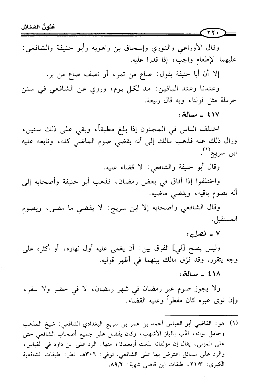 (¬1) هو: القاضي أبو العباس أحمد بن عمر بن سريج البغدادي الشّافعيّ: شيخ المذهب وحامل لوائه، لقّب بالباز الأشهب، وكان يفضل على جميع أصحاب الشّافعيّ حتّى على المزني، يقال إن مؤلفاته بلغت أربعمائة؛ منها: الرَّدِّ على ابن داود في القياس، والرد على مسائل اعترض بها على الشّافعيّ. توفي: 306 هـ. انظر: طبقات الشّافعيّة الكبرى: 3/ 21، طبقات ابن قاضي شهبة: 2/ 89