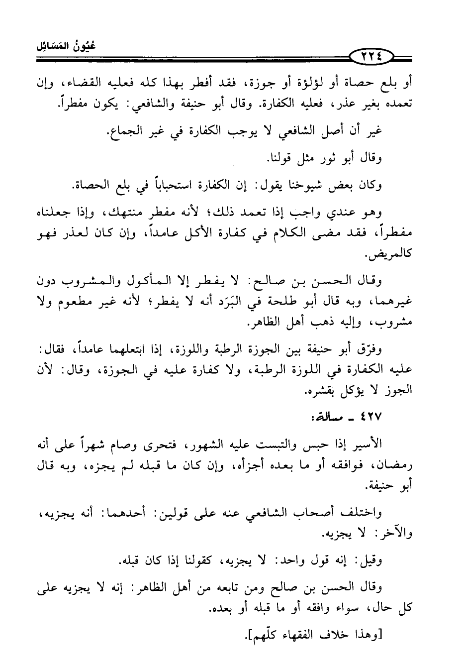 وكان بعض شيوخنا يقول: إن الكفارة استحبابًا في بلع الحصاة.