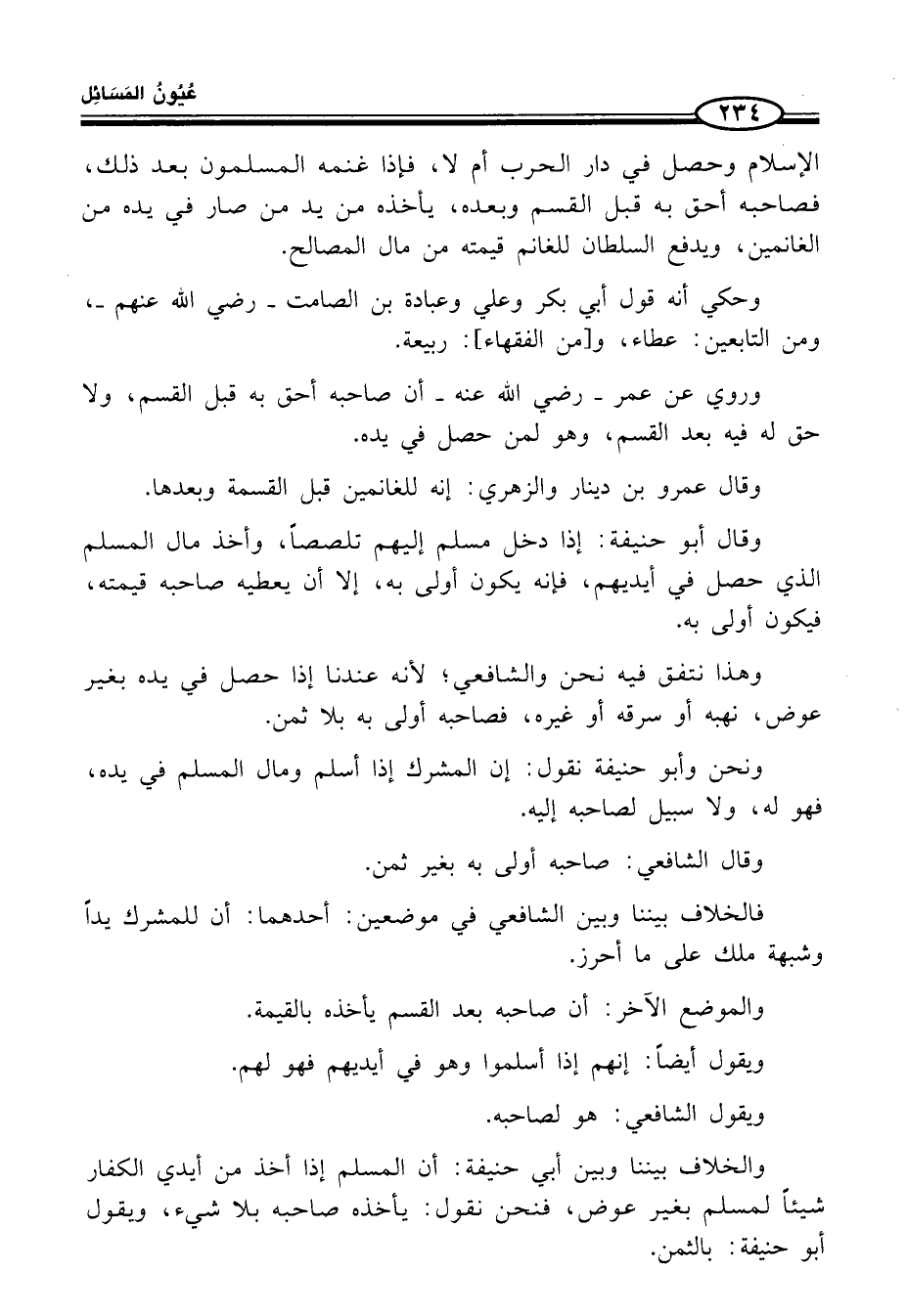 والخلاف بيننا وبين أبي حنيفة: أن المسلم إذا أخذ من أيدي الكفار شيئًا لمسلم بغير عوض، فنحن نقول: يأخذه صاحبه بلا شيء، ويقول أبو حنيفة: بالثّمن.