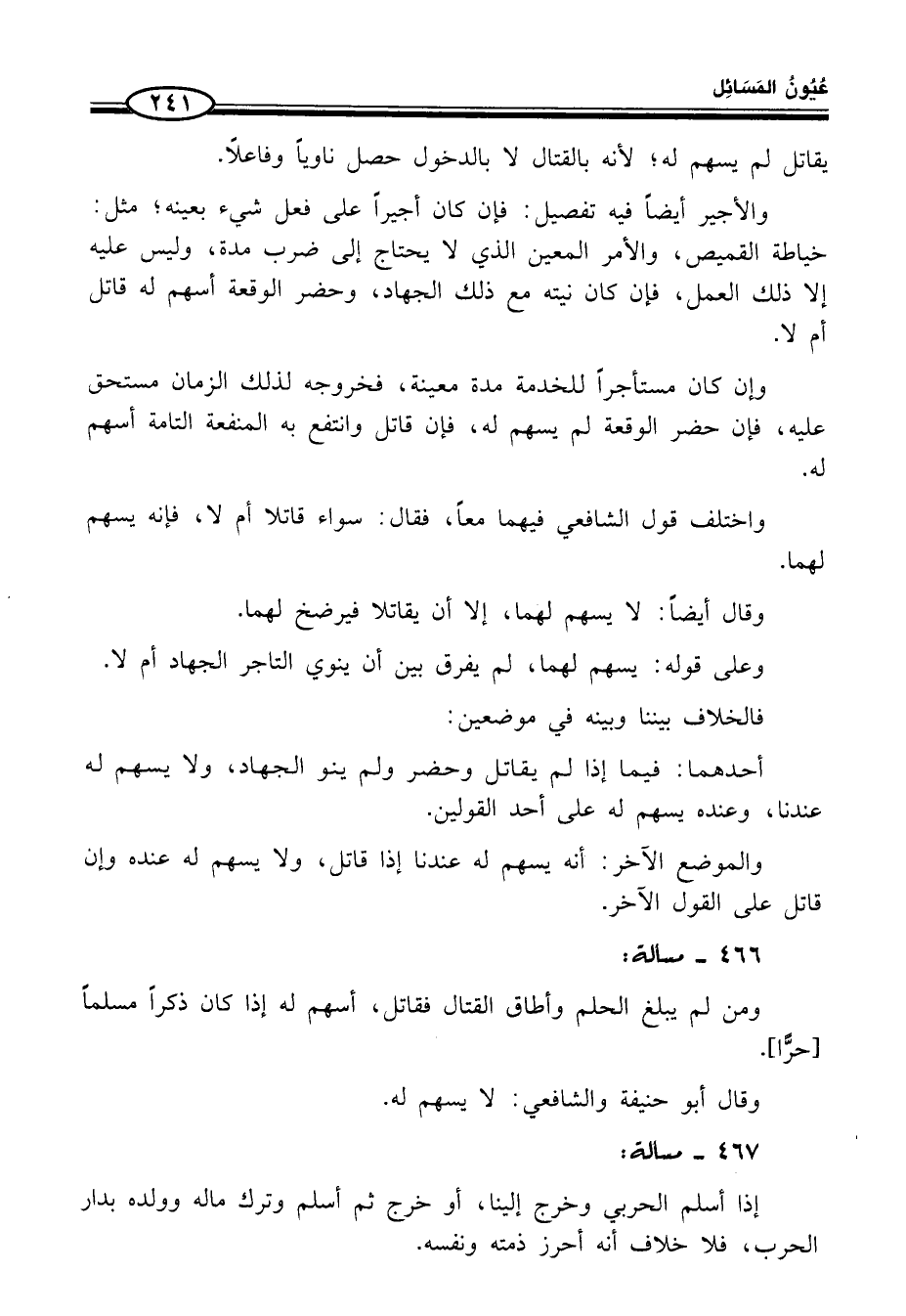 والأجير أيضًا فيه تفصيل: فإن كان أجيرًا على فعل شيء بعينه؟ مثل: خياطة القميص، والأمر المعين الّذي لا يحتاج إلى ضرب مدة، وليس عليه إِلَّا ذلك العمل، فإن كان نيته مع ذلك الجهاد، وحضر الوقعة أسهم له قاتل أم لا.