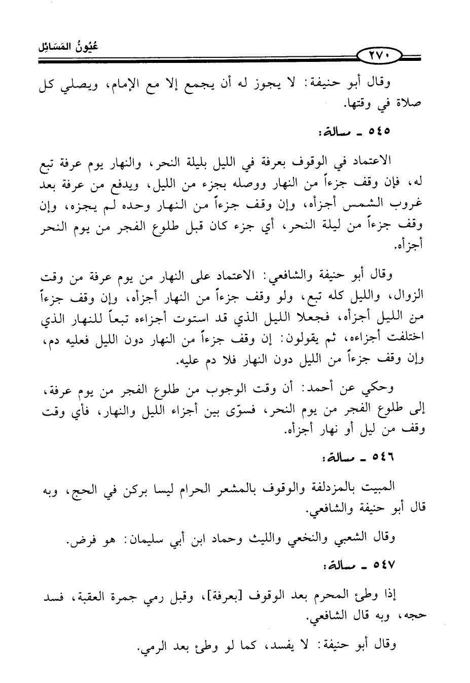 الاعتماد في الوقوف بعرفة في اللّيل بليلة النَّحر، والنهار يوم عرفة تبع له، فإن وقف جزءًا من النهار ووصله بجزء من اللّيل، ويدفع من عرفة بعد غروب الشّمس أجزأه، وإن وقف جزءًا من النهار وحده لم يجزه، وإن وقف جزءًا من ليلة النَّحر، أي جزء كان قبل طلوع الفجر من يوم النَّحر أجزأه.