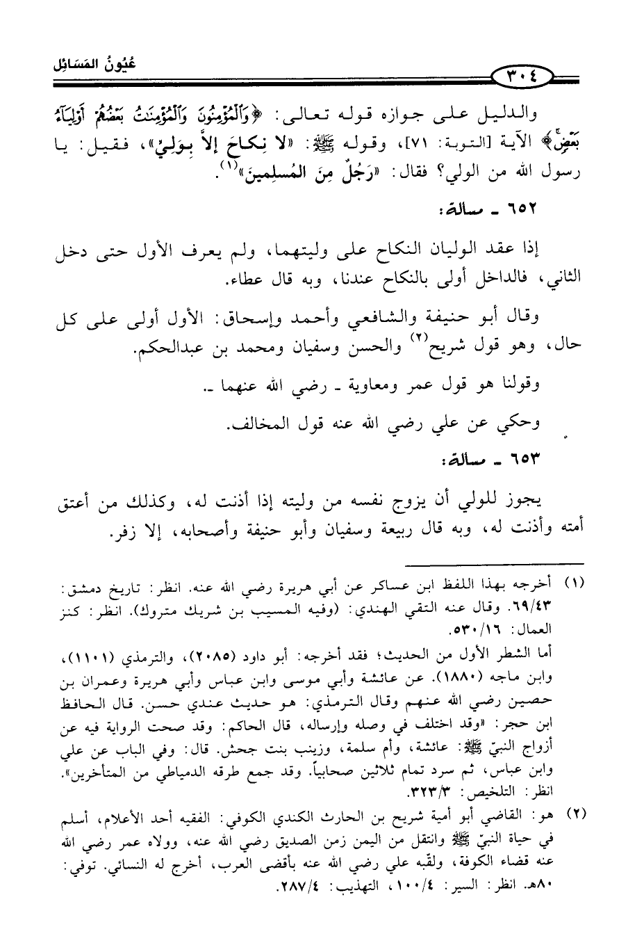 (¬2) هو: القاضي أبو أمية شريح بن الحارث الكندي الكوفي: الفقيه أحد الأعلام، أسلم في حياة النبيّ - صلّى الله عليه وسلم - وانتقل من اليمن زمن الصديق رضي الله عنه، وولاه عمر رضي الله عنه قضاء الكوفة، ولقّبه علي رضي الله عنه بأقضى العرب، أخرج له النسائي. توفي: 80 هـ. انظر: السير: 4/ 100، التهذيب: 4/ 287.
