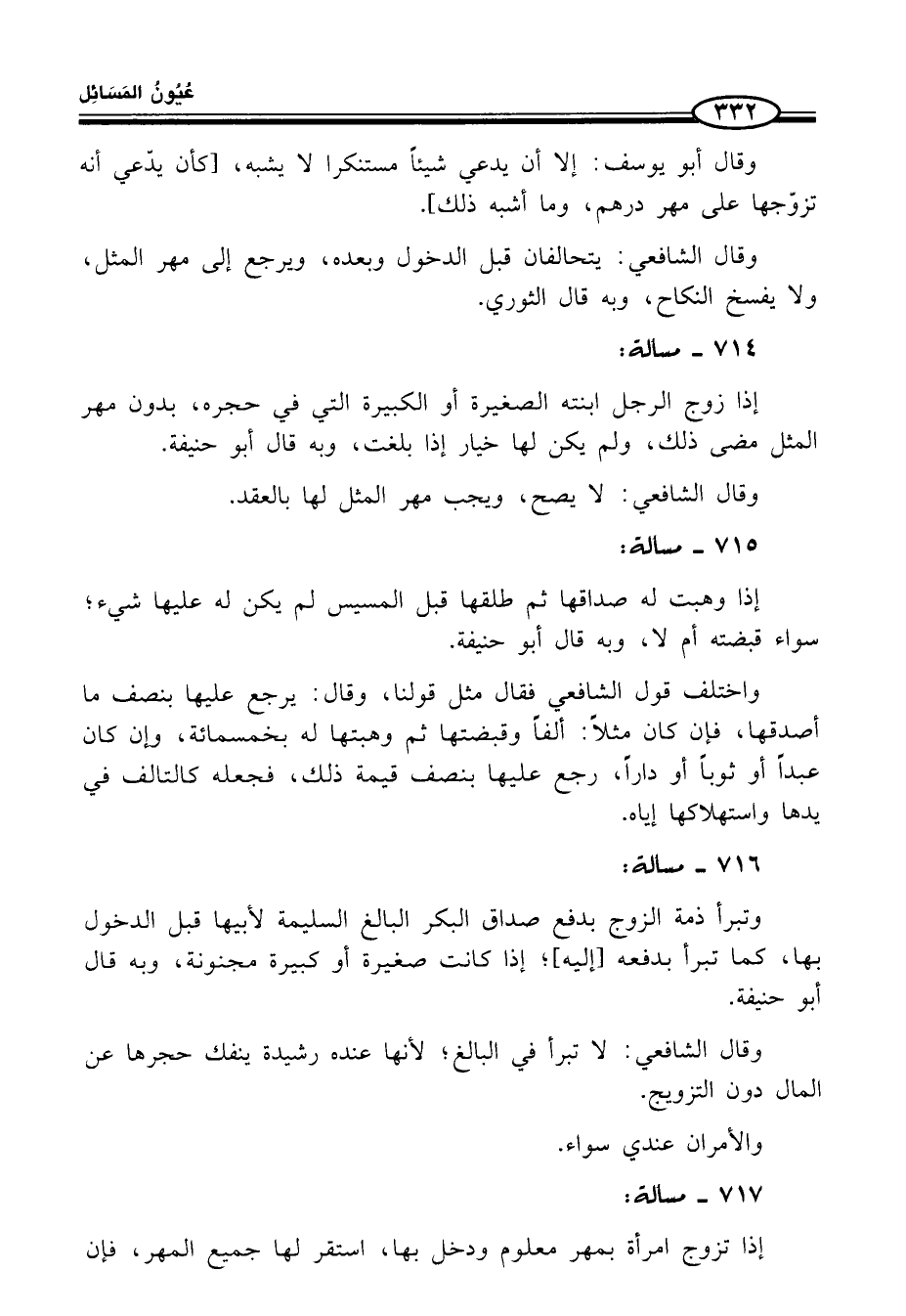 واختلف قول الشّافعيّ فقال مثل قولنا، وقال: يرجع عليها بنصف ما أصدقها، فإن كان مثلًا: ألفا وقبضتها ثمّ وهبتها له بخمسمائة، وإن كان عبدًا أو ثوبًا أو دارًا، رجع عليه ابن صف قيمة ذلك، فجعله كالتالف في يدها واستهلاكها إياه.