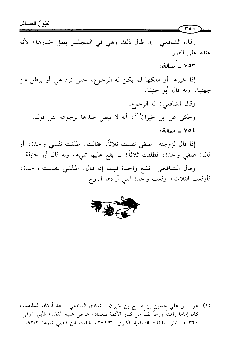 (¬1) هو: أبو علي حسين بن صالح بن خيران البغدادي الشّافعيّ: أحد أركان المذهب، كان إمامًا زاهدًا ورعًا تقيًا من كبار الأئمة ببغداد، عرض عليه القضاء فأبى. توفي: 320 هـ. انظر: طبقات الشّافعيّة الكبرى: 3/ 271، طبقات ابن قاضي شهبة: 2/ 92.