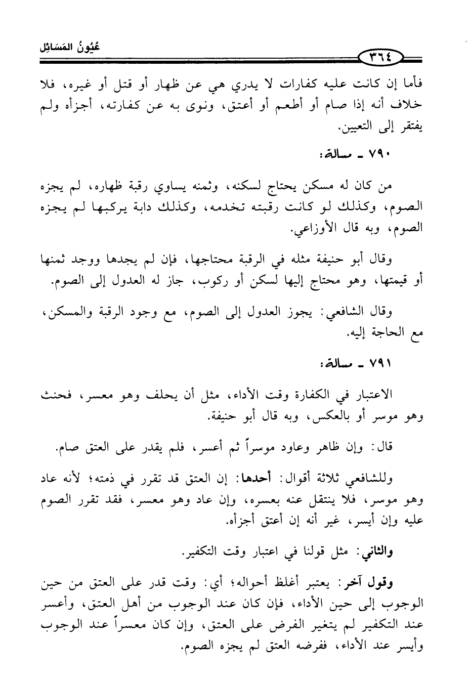 وقول آخر: يعتبر أغلظ أحواله؛ أي: وقت قدر على العتق من حين الوجوب إلى حين الأداء، فإن كان عند الوجوب من أهل العتق، وأعسر عند التكفير لم يتغير الفرض على العتق، وإن كان معسرًا عند الوجوب وأيسر عند الأداء، ففرضه العتق لم يجزه الصوم.