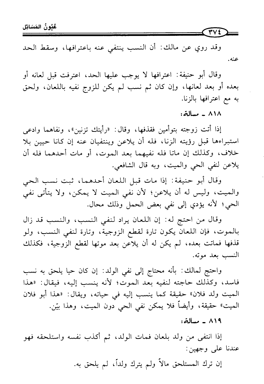 واحتج لمالك: بأنّه محتاج إلى نفي الولد: إن كان حيا يلحق به نسب فاسد، وكذلك حاجته لنفيه بعد الموت؛ لأنّه ينسب إليه، فيقال: "هذا الميِّت ولد فلان" حقيقة كما ينسب إليه في حياته، ويقال: "هذا أبو فلان الميِّت" حقيقة، وأيضًا فلا يمكن نفي الحي دون الميِّت، وهذا بيّن.