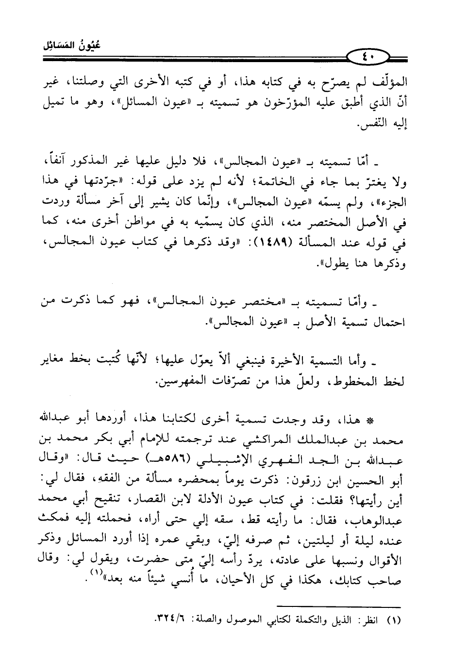 - أمّا تسميته بـ "عيون المجالس"، فلا دليل عليها غير المذكور آنفًا، ولا يغترّ بما جاء في الخاتمة؛ لأنّه لم يزد على قوله: "جرّدتها في هذا الجزء"، ولم يسمّه "عيون المجالس"، وإنّما كان يشير إلى آخر مسألة وردت في الأصل المختصر منه، الّذي كان يسمّيه به في مواطن أخرى منه، كما في قوله عند المسألة (1489): "وقد ذكرها في كتاب عيون المجالس، وذكرها هنا يطول".