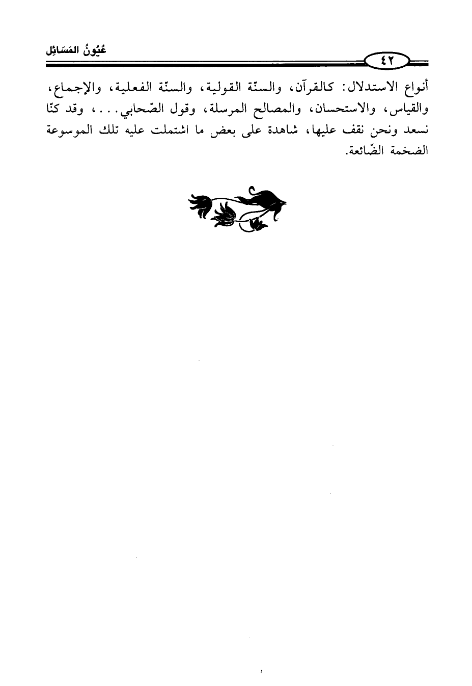 أنواع الاستدلال: كالقرآن، والسُّنَّة القولية، والسنّة الفعلية، والإجماع، والقياس، والاستحسان، والمصالح المرسلة، وقول الصّحابي ... ، وقد كنّا نسعد ونحن نقف عليها، شاهدة على بعض ما اشتملت عليه تلك الموسوعة الضخمة الضّائعة.