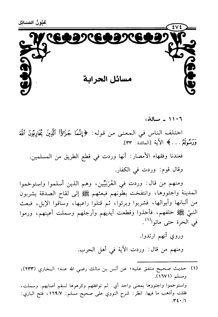ومنهم من قال: وردت في العُرَنِيِّين، وهم الذين أسلموا واستوخموا المدينة واجتووها، وانتفخت بطونهم فبعثهم - صلّى الله عليه وسلم - إلى لقاح الصَّدقة يشربون من ألبأنّها وأبوالها، فشربوا وبرئوا، ثمّ قتلوا راعيها، وساقوا الإبل، فبعث النبيّ - صلّى الله عليه وسلم - خلفهم، فأخذوا وقطعت أيديهم وأرجلهم وسملت أعينهم، ورموا في الحرة حتّى ماتوا (¬1).