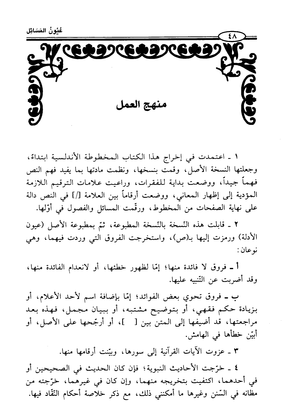 1 - اعتمدت في إخراج هذا الكتاب المخطوطة الأندلسية ابتداءً، وجعلتها النسخة الأصل، وقمت بنسخها، ونظمت مادتها بما يفيد فهم النص فهمًا جيدًا، ووضعت بداية للفقرات، وراعيت علامات الترقيم اللازمة المؤدية إلى إظهار المعاني، ووضعت أرقامًا بين العلّامة [/] في النص دالة على نهاية الصفحات من المخطوط، ورقّمت المسائل والفصول في أوّلها.