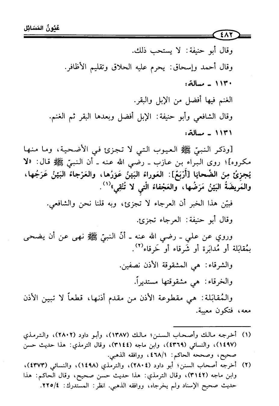 [وذكر النبيّ - صلّى الله عليه وسلم - العيوب الّتي لا تجزئ في الأضحية، وما منها مكروه]؛ روى البراء بن عازب -رضى الله عنه - أن النبيّ - صلّى الله عليه وسلم - قال: "لا يُجزِئُ مِنَ الضَّحايَا [أَرْبَعٌ]: العَوراءُ البَيّنُ عَوَرُها، والعَرْجاءُ البَيِّنُ عَرَجُها، والمَريضَةُ البَيِّنُ مَرَضُها، والعَجْفاءُ الّتىِ لا تُنْقِي" (¬1).