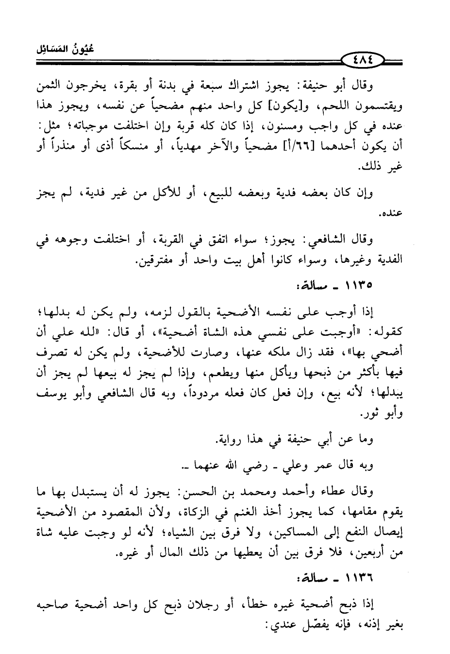 وقال أبو حنيفة: يجوز اشتراك سبعة في بدنة أو بقرة، يخرجون الثّمن ويقتسمون اللّحم، و [يكون] كلّ واحد منهم مضحيًا عن نفسه، ويجوز هذا عنده في كلّ واجب ومسنون، إذا كان كله قربة وإن اختلفت موجباته؛ مثل: أن يكون أحدهما [66/أ] مضحيًا والآخر مهديًا، أو منسكًا أذى أو منذرًا أو غير ذلك.
