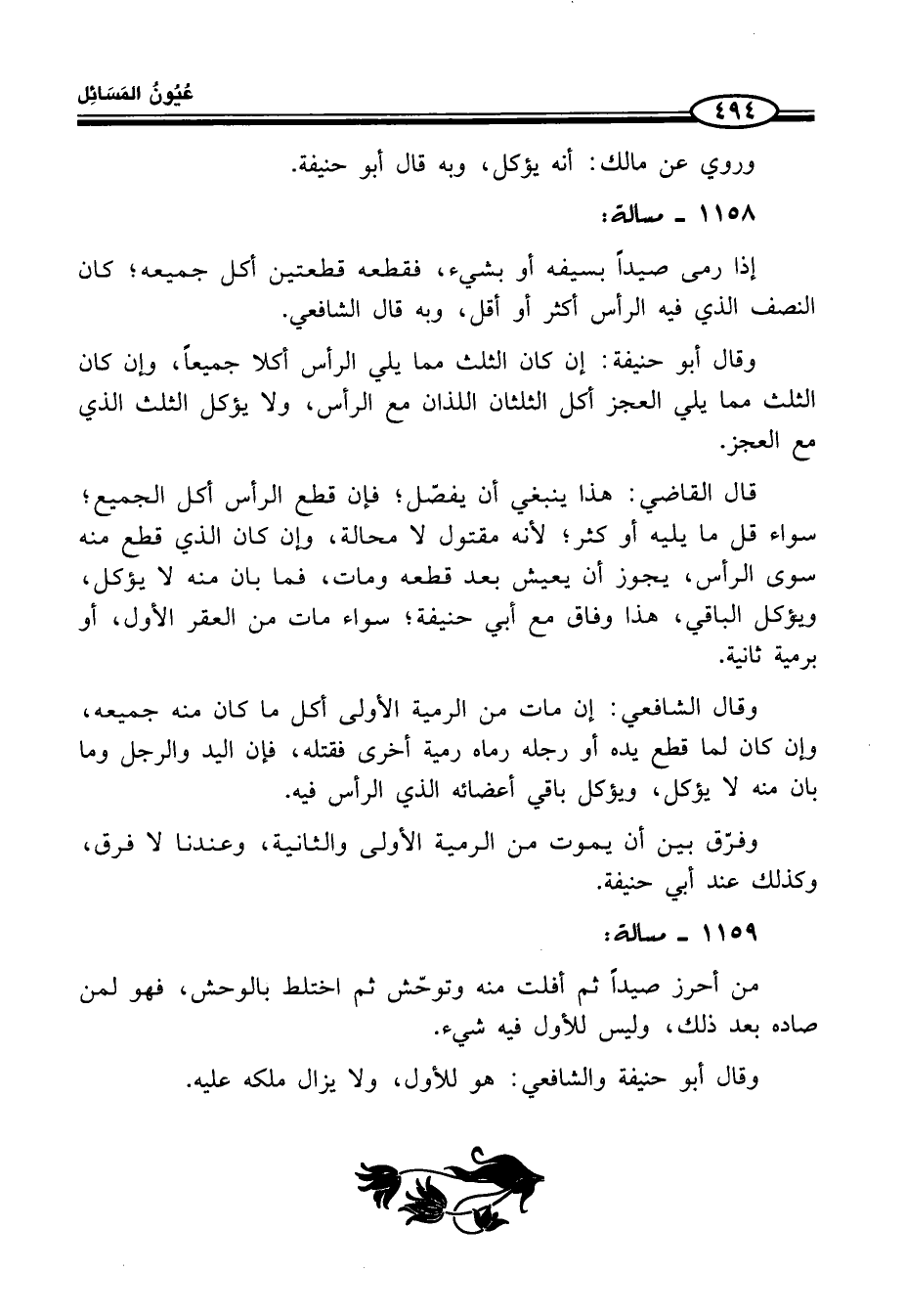 قال القاضي: هذا ينبغي أن يفصّل؛ فإن قطع الرّأس أكل الجميع؛ سواء قل ما يليه أو كثر؛ لأنّه مقتول لا محالة، وإن كان الّذي قطع منه سوى الرّأس، يجوز أن يعيش بعد قطعه ومات، فما بان منه لا يؤكل، ويؤكل الباقي، هذا وفاق مع أبي حنيفة؛ سواء مات من العقر الأوّل، أو برمية ثانية.