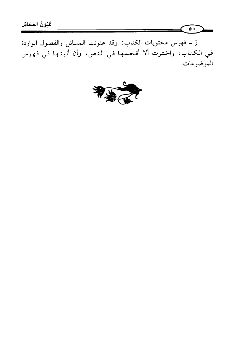 ز - فهرس محتويات الكتاب: وقد عنونت المسائل والفصول الواردة في الكتاب، واخترت ألَّا أقحمها في النص، وأن أثبتها في فهرس الموضوعات.