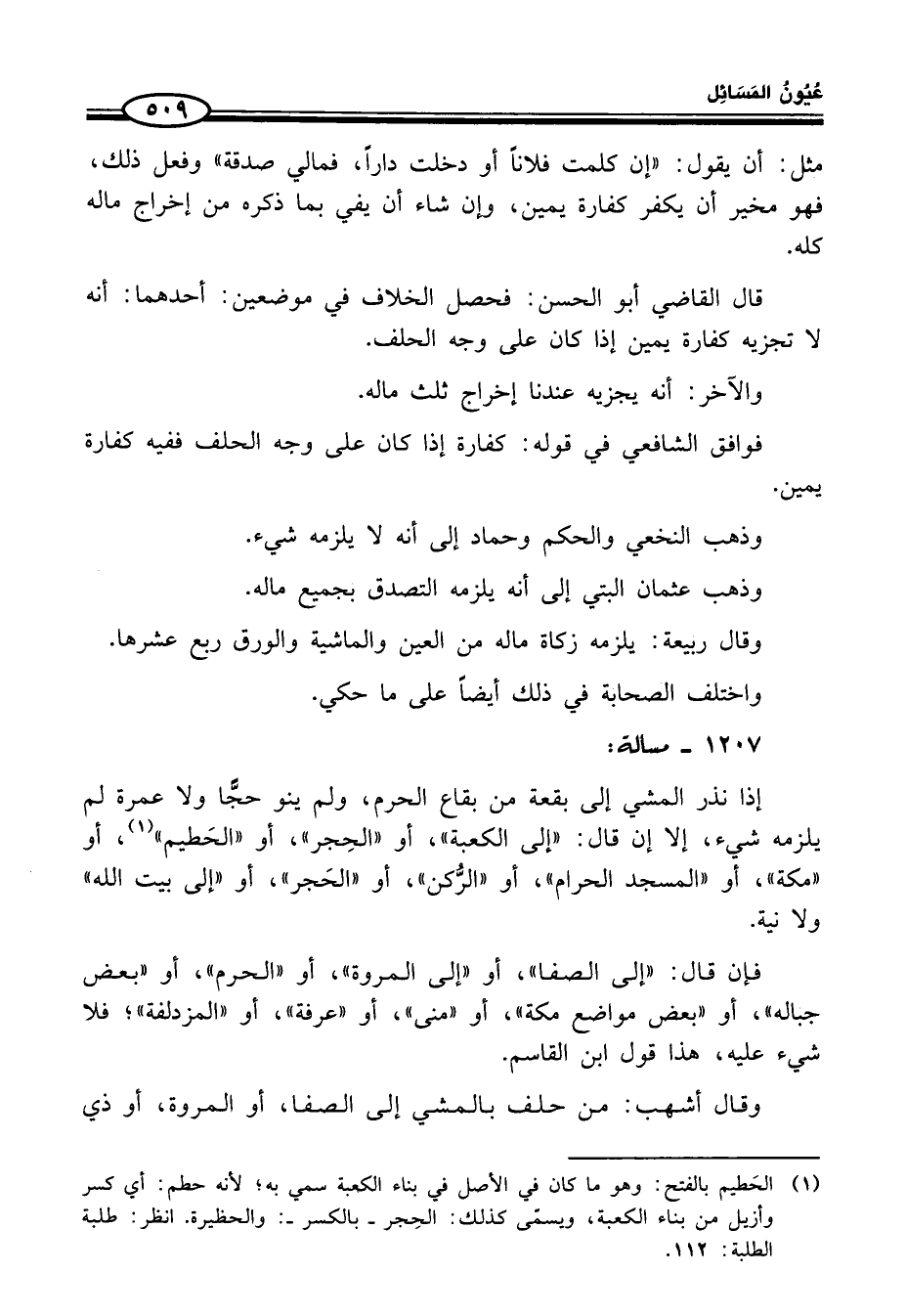 (¬1) الحَطيم بالفتح: وهو ما كان في الأصل في بناء الكعبة سمي به؛ لأنّه حطم: أي كسر وأزيل من بناء الكعبة، ويسمّى كذلك: الحِجر- بالكسر-: والحظيرة. انظرت طلحة الطلبة: 112.
