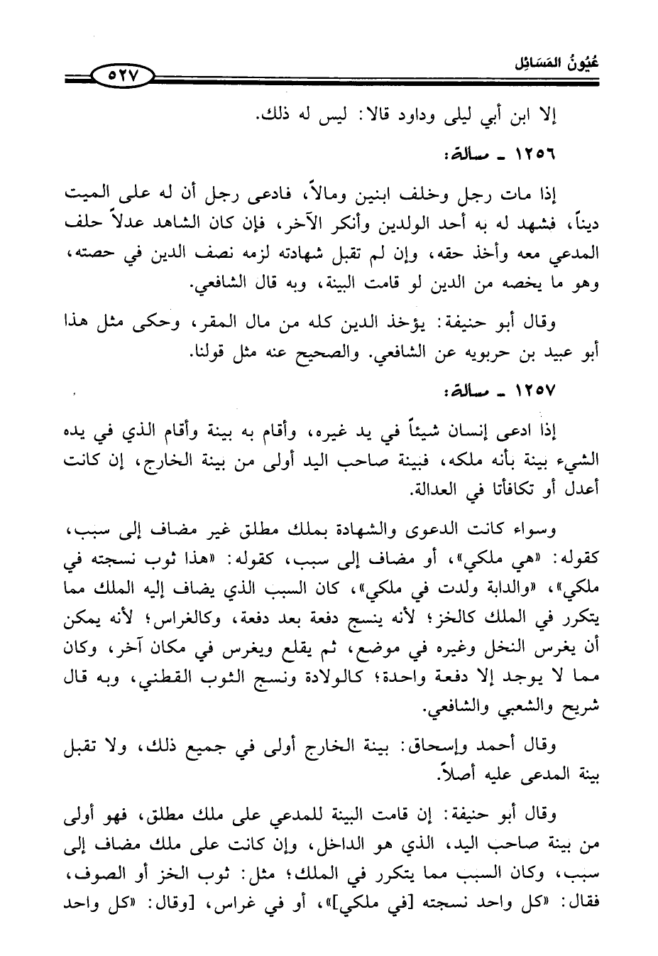 وقال أبو حنيفة: إن قامت البينة للمدعي على ملك مطلق، فهو أولى من بينة صاحب اليد، الّذي هو الداخل، وإن كانت على ملك مضاف إلى سبب، وكان السبب ممّا يتكرر في الملك؛ مثل: ثوب الخز أو الصوف، فقال: "كلّ واحد نسجته [في ملكي] "، أو في غراس، [وقال: "كلّ واحد