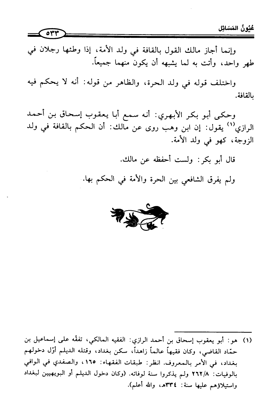 (¬1) هو: أبو يعقوب إسحاق بن أحمد الرازي: الفقيه المالكي، تفقّه على إسماعيل بن حمّاد القاضي، وكان فقيهًا عالمًا زاهدًا، سكن بغداد، وقتله الديلم أؤل دخولهم بغداد، في الأمر بالمعروف. انظر: طبقات الفقهاء: 165، والصفدي في الوافي بالوفيات: 8/ 262 ولم يذكروا سنة لوفاته. (وكان دخول الديلم أو البويهبين لبغداد واستيلاؤهم عليها سنة: 334 هـ، والله أعلم).