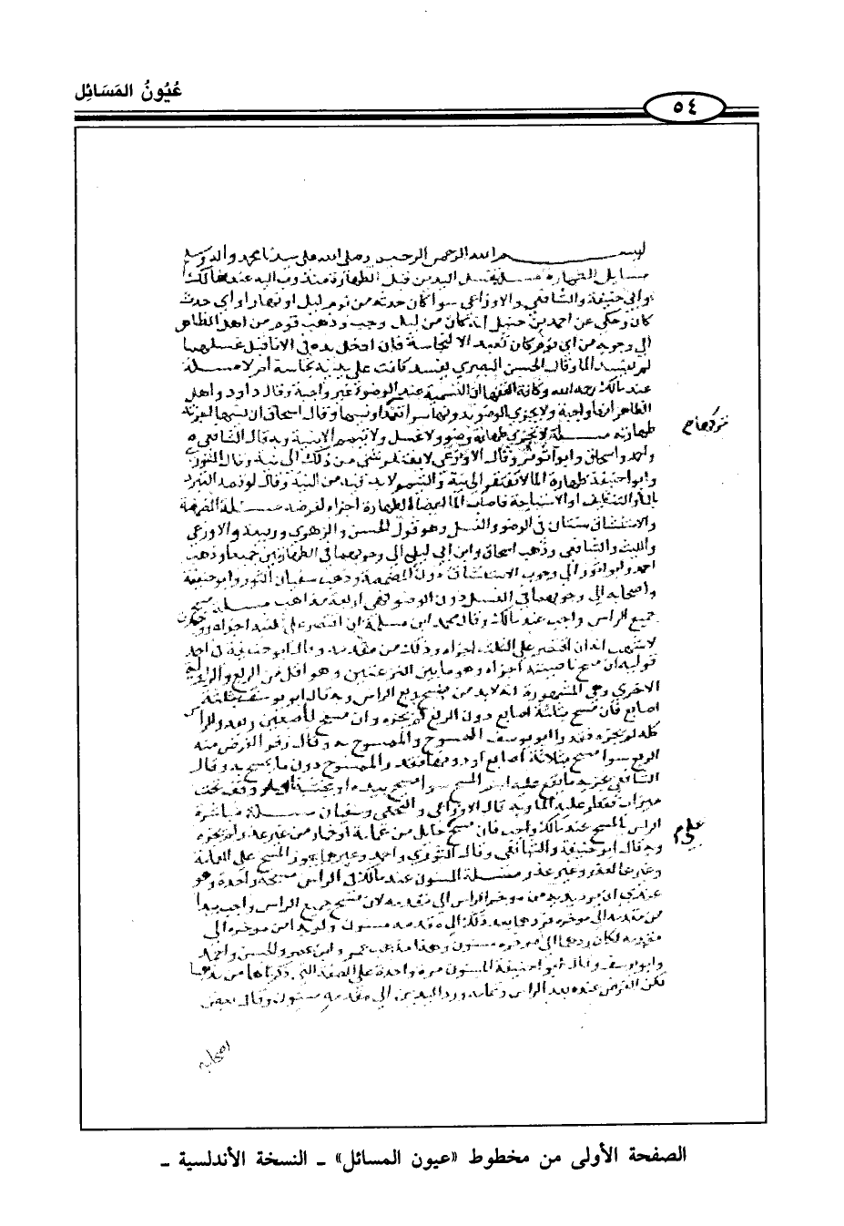 الصفحة الأولى من مخطوط "عيون المسائل" - النسخة الأندلسية -